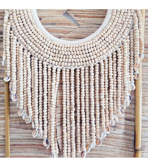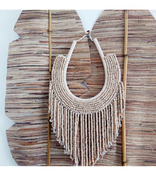 Collier décoratif en petites perles de bois. A la fois ethnique et tribal, il est réalisé de façon traditionnel à Bali, cette pièce de caractère apportera une indéniable touche d'originalité à votre intérieur. Ce collier est livré sans socle en métal pour être accroché sur un mur. Couleur : naturel. Matières : perles de bois. Dimensions : L25 x H45 cm