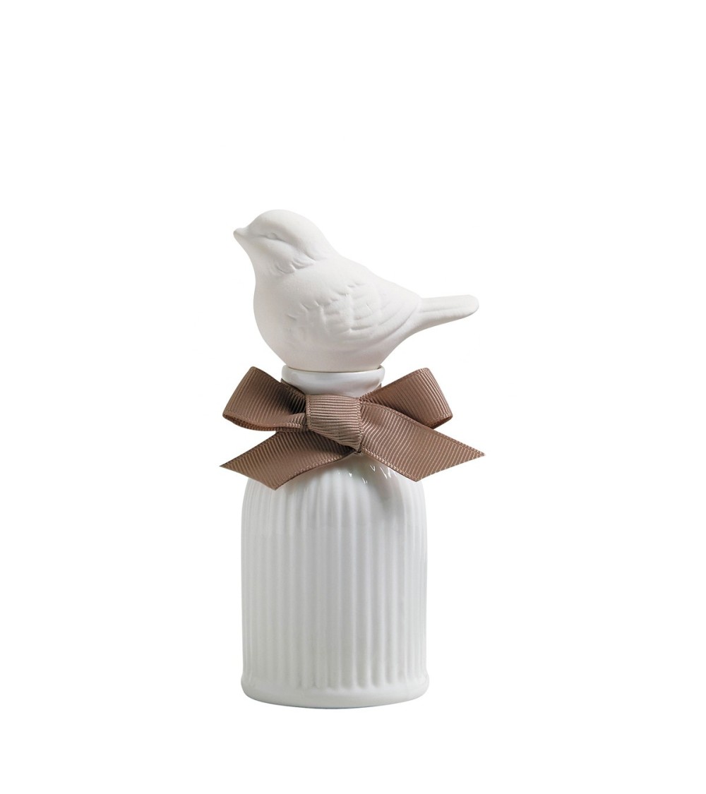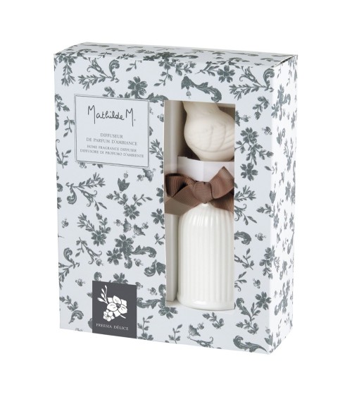 Laissez-vous séduire par Bel Oiseau, un diffuseur de parfum d'ambiance en céramique aux lignes chics et bucoliques, qui parfumera durablement votre intérieur avec Freesia Délice, une senteur tendre et suave aux accents pétillants de fruits rouges sublimés par un bouquet de freesias et de roses.Une fois placé dans le diffuseur, l'oiseau en biscuit de porcelaine s'imprègne du parfum par capillarité pour le diffuser progressivement dans l'air ambiant.Le diffuseur Bel Oiseau est une alternative aux diffuseurs de parfum d'ambiance à tiges.Ce coffret contient :- Un diffuseur de parfum d'ambiance en céramique- Un oiseau en biscuit de porcelaine- Une recharge pour diffuseur de parfum d'ambiance 100 ml, parfum Freesia DéliceNos conseils d'utilisationRenouvelez la recharge ou changez de senteur au gré de vos envies pour prolonger à l'infini la durée de vie du diffuseur.Informations complémentaires :Dimensions diffuseur : Ø 5,5 x 9,7 cmDimensions oiseau : 8 x 6 x 4 cmDimensions boîte : 16,5 x 21 x 6 cm - Matière : Biscuit de porcelaine - Senteur : Freesia Délice