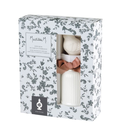 Laissez-vous séduire par Bel Oiseau, un diffuseur de parfum d'ambiance en céramique aux lignes chics et bucoliques, qui parfumera durablement votre intérieur avec Rose Élixir, un parfum voluptueux et envoûtant, mariage de la rose, reine des fleurs, et des notes poudrées de la violette, sur un lit de muscs blancs.Une fois placé dans le diffuseur, l'oiseau en biscuit de porcelaine s'imprègne du parfum par capillarité pour le diffuser progressivement dans l'air ambiant.Le diffuseur Bel Oiseau est une alternative aux diffuseurs de parfum d'ambiance à tiges.Ce coffret contient :- Un diffuseur de parfum d'ambiance en céramique- Un oiseau en biscuit de porcelaine- Une recharge pour diffuseur de parfum d'ambiance 100 ml, parfum Rose ElixirNos conseils d'utilisationRenouvelez la recharge ou changez de senteur au gré de vos envies pour prolonger à l'infini la durée de vie du diffuseur.Informations complémentaires :Dimensions diffuseur : ? 5,5 x 9,7 cmDimensions oiseau : 8 x 6 x 4 cmDimensions boîte : 16,5 x 21 x 6 cm - Matière : Biscuit de porcelaine - Senteur : Rose Élixir