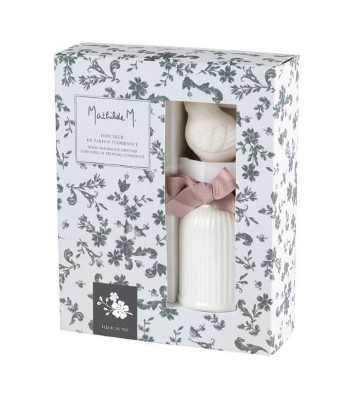Laissez-vous séduire par Bel Oiseau, un diffuseur de parfum d'ambiance en céramique aux lignes chics et bucoliques, qui parfumera durablement votre intérieur avec Fleur de Thé, une senteur douce et enveloppante au sillage intense qui dévoile en son cur des notes de thé blanc et de rose, illuminés par la vanille et l'ambre.Une fois placé dans le diffuseur, l'oiseau en biscuit de porcelaine s'imprègne du parfum par capillarité pour le diffuser progressivement dans l'air ambiant.Le diffuseur Bel Oiseau est une alternative aux diffuseurs de parfum d'ambiance à tiges.Ce coffret contient :- Un diffuseur de parfum d'ambiance en céramique- Un oiseau en biscuit de porcelaine- Une recharge pour diffuseur de parfum d'ambiance 100 ml, parfum Fleur de ThéNos conseils d'utilisationRenouvelez la recharge ou changez de senteur au gré de vos envies pour prolonger à l'infini la durée de vie du diffuseur.Informations complémentaires :Dimensions diffuseur : Ø 5,5 x 9,7 cmDimensions oiseau : 8 x 6 x 4 cmDimensions boîte : 16,5 x 21 x 6 cm - Matière : Biscuit de porcelaine - Senteur : Fleur de Thé