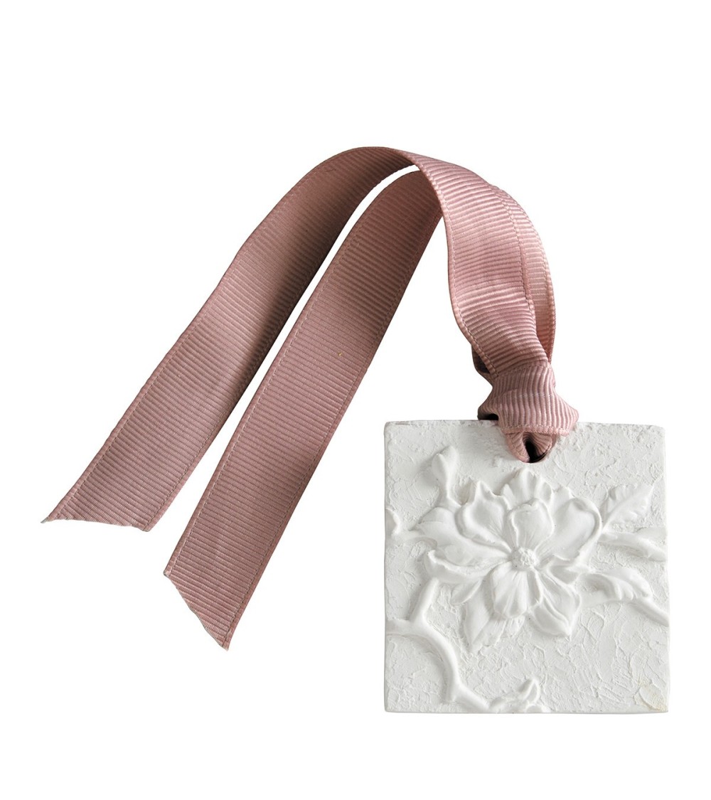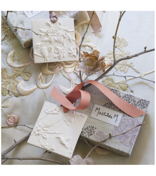 Savoir-faire emblématique de notre marque, ces décors en plâtre parfumé, minutieusement ciselés à la main, sont fabriqués dans nos ateliers. Entièrement imprégnés de parfum, ils libèrent lentement et pour longtemps leur douce senteur partout où ils sont posés. Découvrez une manière originale et authentique de parfumer les petits espaces de votre maison en les plaçant dans vos armoires, tiroirs, bagages...Laissez-vous transporter par la senteur Fleur de Thé de notre décor parfumé Jardin d'Ailleurs.Nos conseils d'utilisationLorsque la senteur s'estompe, ravivez-la avec le concentré de parfum d'ambiance 5 ml Fleur de Thé Mathilde M. Une vaporisation appliquée à 10 cm environ du décor suffit à le reparfumer pour plusieurs semaines.Informations complémentairesDimensions : 5,1 x 5,1 x 0,9 cm
