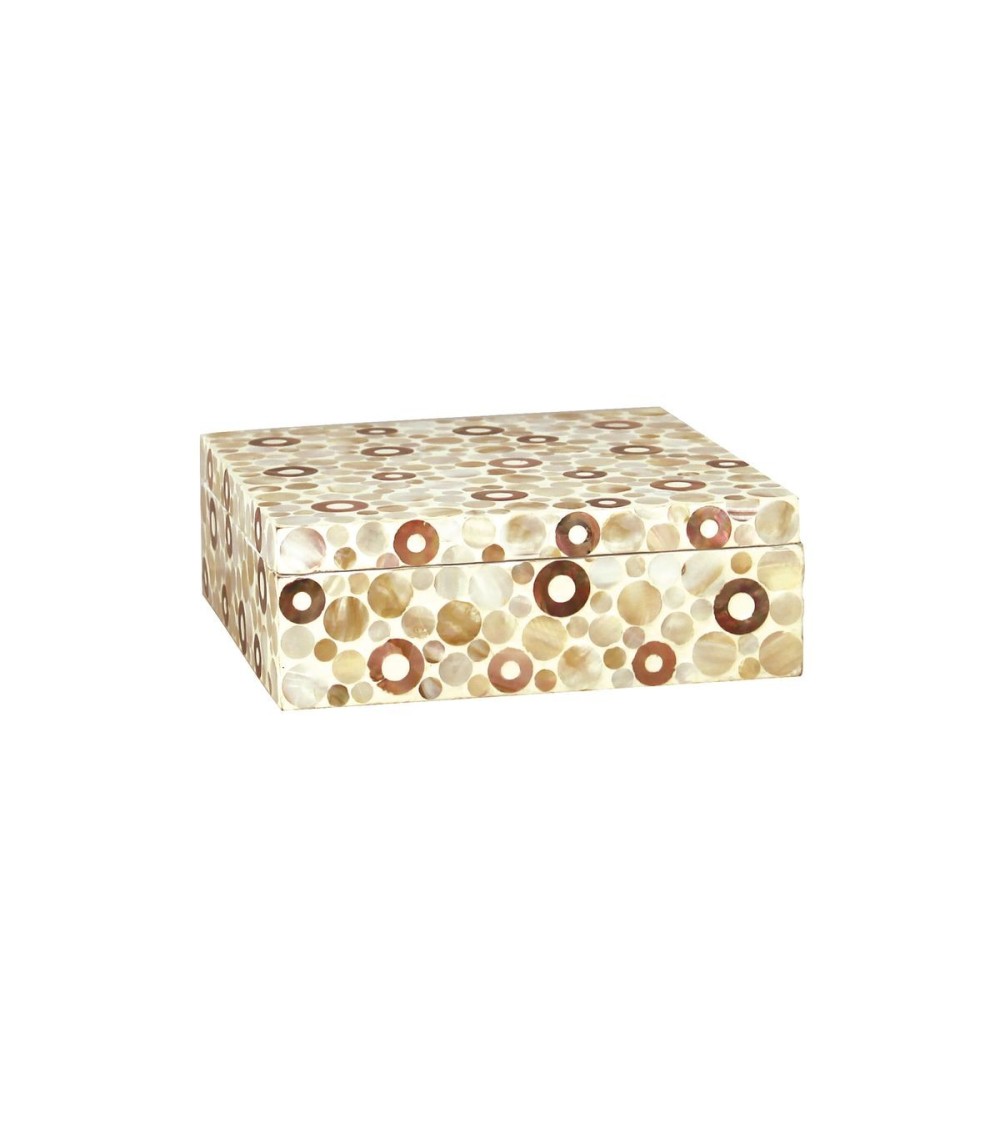 Aussi élégante dans un bureau que dans un salon, cette jolie boite en bois laqué ornera tous les plans de travail et se mariera avec bonheur aux autres modèles de la collection Danang. Boite avec couvercle en bois couvert de nacres finition lacquée brillante DIM (cm): 23x23x8 Utiliser un chiffon humide