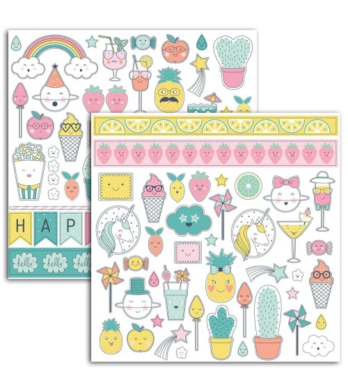 2 planches de stickers fantaisie. Couleurs douces et poudrées : rose pâle, orange, jaune, bleu ciel, vert / Thème du monde imaginaire avec des licornes, des arcs en ciel, des gourmandises et des ananas dans un univers kawaï. 98 stickers. Dimensions d'une planche : 15 x 15 cm. Sans acide.