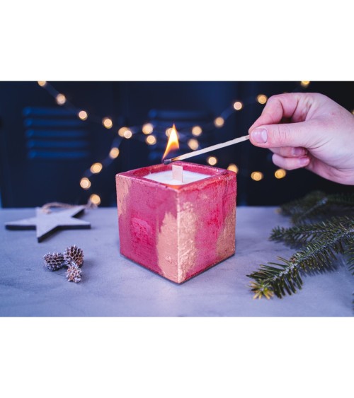 Découvrez la bougie de Noël. Un bougeoir en béton couleur brique sur lequel nous avons appliqué une belle patine cuivrée qui donne à cette matière brute un effet scintillant. La bougie a été coulée à la main dans notre atelier Français. Il s'agit d'une bougie 100% végétale composée d'une cire de soja et d'une mèche en bois. Son parfum ''Délices de Noël'' aux notes de cannelle, de zestes d'agrumes, d'épices et de miel vous plongera dans une ambiance cocooning ! Les fragrances utilisées proviennent de la ville de Grasse.