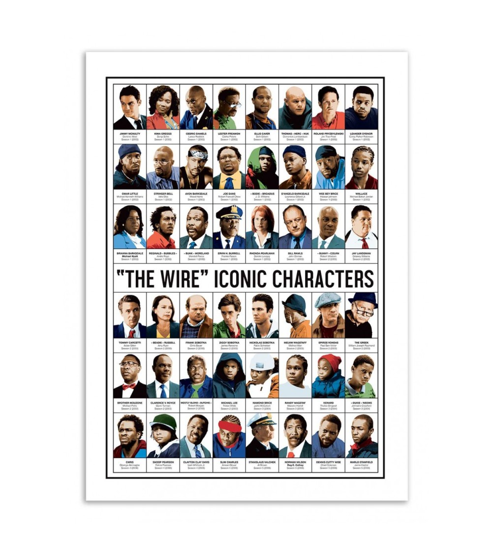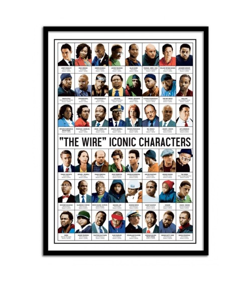 LES AFFICHES : Nos affiches sont imprimées en France, ou Union Européenne.Papier issu de forêts certifiées FSC.Affiche imprimée sur papier couché mat 250g, Haute Définition.Pour les formats d'affiches 30x40 cm : contient des marges blanches de 1,5 cm.Pour les formats d'affiches 50x70 cm : contient des marges blanches de 2 cm.OPTION CADRES : Nos cadres en bois sont fabriqués en France.Comprend une vitre en verre acrylique.Dimensions des cadres en bois 30x40 cm : Epaisseur du cadre : 15 mm, Profondeur du cadre : 20 mmDimensions des cadres en bois 50x70 cm : Epaisseur du cadre : 15 mm. Profondeur du cadre : 20 mm. Découvrez une mozaïque de 48 personnages sur une seule affiche, inspirée de la série The Wire. Olivier Bourdereau expose ces personnages cultes comme Jimmy Mc Nulty, Omar, Stringer Bell, Avon Barksdale et bien d'autres, dans une composition de type encyclopédique où l'on retrouve les informations importantes de nos personnages préférés. Convient parfaitement à tous les fans de cinéma !