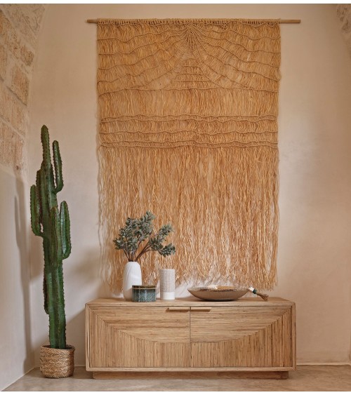 Donnez à votre déco une tonalité exotique en accrochant la décoration murale TANJA ! Avec son tressage de fibres végétales maintenu sur un support de bois de bouleau, cette très grande déco murale sera la pièce maîtresse de votre intérieur, impossible de passer à côté !
