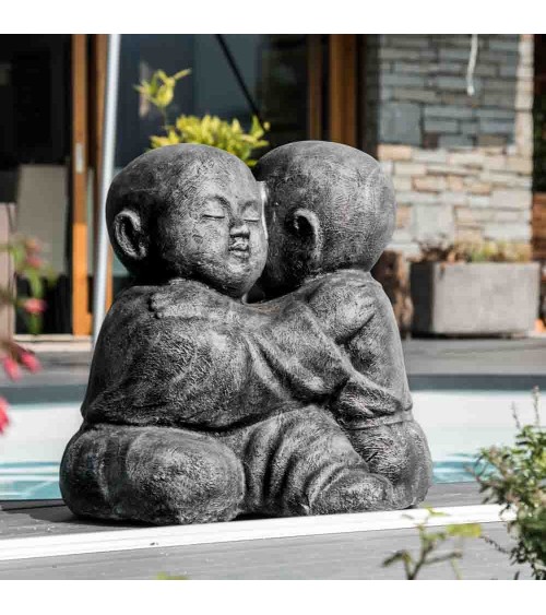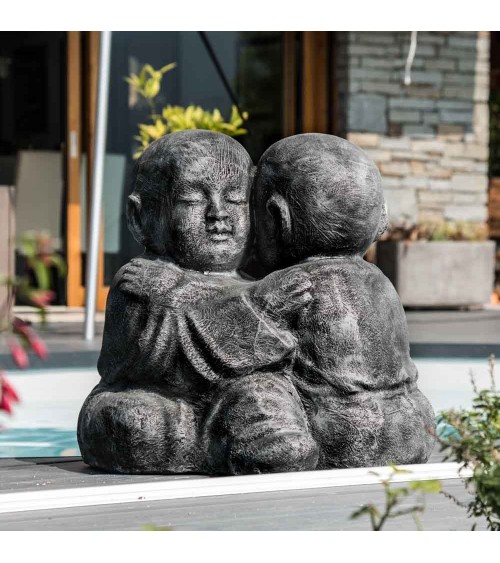 Choisissez la statue moines Shaolin enlacés 50 cm pour la décoration zen de votre intérieur ou de votre extérieur. Cette statue de jardin offre une ambiance relaxante et reposante. Autour d'un bassin ou sur votre terrasse, cet objet déco permet de créer un lieu accueillant. Laissez-vous attendrir par le regard de ces moines et voyager au sein de la culture asiatique ! Retrouvez toutes nos statues en fibro-ciment ici. Dimensions Longueur : 56 cm Largeur : 44 cm Hauteur : 50 cm Détails La résine utilisée pour la fabrication des objets de décoration est un amalgame de fibre de verre, de résine, de ciment et de durcisseur, rendant les objets particulièrement durs et robustes. Afin d'optimiser la longévité du produit, nous vous conseillons l'application d'un hydrofuge.