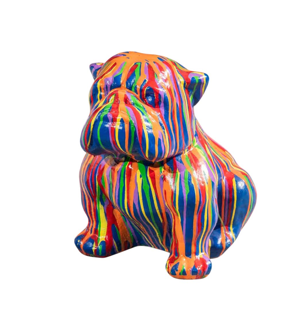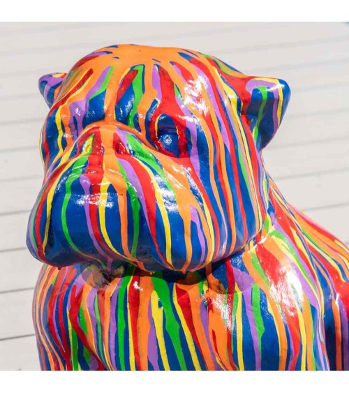 Cette oeuvre design et contemporaine créée instantanément un univers unique et une déco tendance et actuelle. Cette statue bouledogue sera parfaite pour décorer avec style et subtilité un jardin, une terrasse ou encore une chambre ou une entrée. Chaque pièce est réalisée à la main, ce qui en fait un modèle unique dont le décor peut varier par rapport à la photo présentée. Statue fabriquée artisanalement en fibrociment et entièrement peinte à la main. Traitement anti UV, gel et intempérie. Disponible également en blanc, rouge et noir. Retrouvez toutes nos statues en fibrociment ici. Dimensions Longueur : 44 cm Largeur : 31 cm Hauteur : 42 cm Détails La résine utilisée pour la fabrication des objets de décoration est un amalgame de fibre de verre, de résine, de ciment et de durcisseur, rendant les objets particulièrement durs et robustes. Afin d'optimiser la longévité du produit, nous vous conseillons l'application d'un hydrofuge.