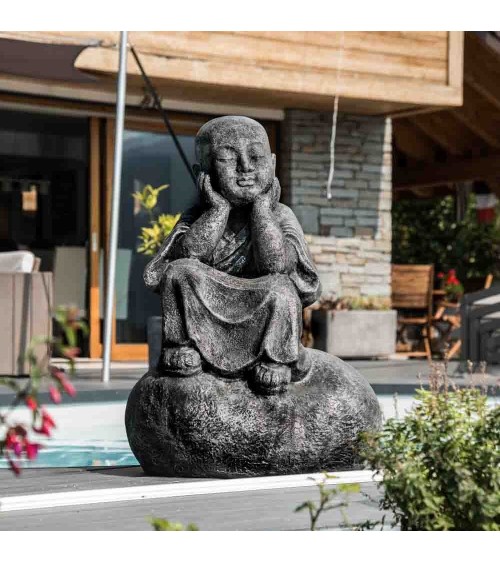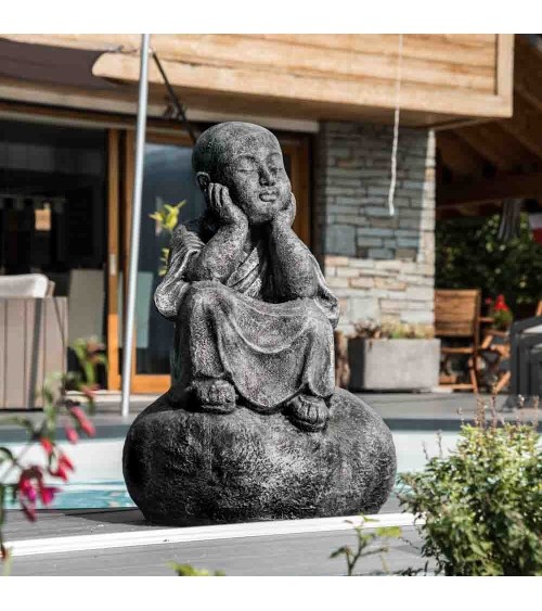 Sublimez votre espace vert avec cette statue Moine Shaolin pensif patiné gris de 80 cm. Cette statue de jardin est une réelle invitation à la détente et à la relaxation. Pour un intérieur feng-shui ou une décoration zen dans votre espace naturel, cet objet déco est idéal. Elle permet de créer à la fois une ambiance exotique et unique. Retrouvez toutes nos statues en fibro-ciment ici. Dimensions Longueur : 55 cm Largeur : 45 cm Hauteur : 80 cm   Détails La résine utilisée pour la fabrication des objets de décoration est un amalgame de fibre de verre, de résine, de ciment et de durcisseur, rendant les objets particulièrement durs et robustes.  Afin d'optimiser la longévité du produit, nous vous conseillons l'application d'un hydrofuge.