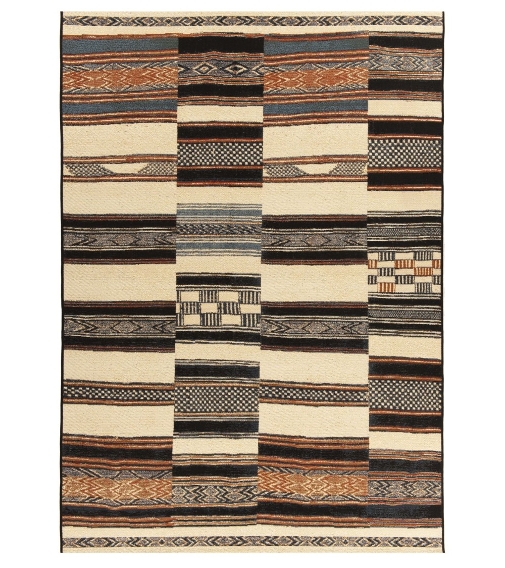 Ce beau tapis tissé se montre dans des motifs abstraits asymétriques. Les diamants et les dentelures sont disposés de façon sauvage et libre et se combinent en différentes tailles pour former un ensemble complexe et inhabituel. Le charisme de ce look ethnique incomparable combine les modèles traditionnels de différentes cultures. Le spectre de couleurs chaudes et intenses va du terreux au rougeâtre et donne vie à tous les sols. Fabriqué à partir de fibres de polypropylène et de polyester de haute qualité, dont les substances nocives ont été testées, ce tissu à tissage plat court peut résister aux plus grandes contraintes et vous ravira pendant des années grâce à son aspect impeccable. Les fibres synthétiques très durables utilisées dans ce produit offrent également d'autres excellentes caractéristiques de performance telles que la résistance à l'humidité et aux rayons UV. Cette combinaison de matériaux et de propriétés d'utilisation fait de ce tapis un produit polyvalent unique dans votre espace de vie intérieur et extérieur. La plupart des taches peuvent être facilement enlevées avec un chiffon humide et pour les taches tenaces, vous pouvez simplement utiliser une mousse de tapis standard. Le matériau traité sèche à nouveau rapidement lorsqu'il est humide, sans se décolorer ni même se tacher, ce qui est bien sûr synonyme de la solidité des couleurs de ce produit.Ce tapis peut également être posé sans problème dans les pièces équipées d'un chauffage au sol. Ce passe-partout exotique à l'allure africaine transforme votre maison en un lieu de rencontre de différents modèles culturels et traditionnels et transmet une pure joie de vivre. Le tapis parfait pour l'intérieur et l'extérieur !Veuillez noter que les couleurs de votre écran peuvent être différentes des couleurs d'origine. Nous recommandons une sous-couche antidérapante.Méthode de fabrication: tissé à la machineMatériel de pile: 76% Polypropylen / 24% PolyesterPoids: 960gHauteur: 5.00mmOrigine: Egypt