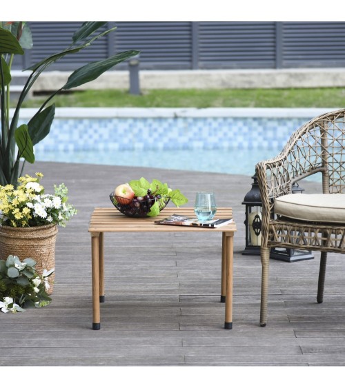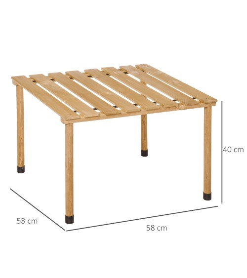 Cette jolie table basse pliable est très facile, rapide à démonter/monter. Son plateau à lattes est enroulable, ses pieds sont dévissables en 2 temps 3 mouvements, sans oublier son sac de transport fourni ! C'est la table basse indispensable pour votre jardin, pour aller au camping, pour faire un pique-nique plus confortablement. Caractéristiques : - Table basse en bois massif de sapin pré-huilé style bohème au naturel très élégant afin de s'intégrer dans tous les environnements (jardin, terrasse, balcon, camping, etc...)- Table basse carrée et compacte pour un usage plus pratique (optimisation de votre espace libre disponible)- Table basse très facile, rapide à plier : conception unique du plateau à enroulement rend la table facile à ranger et à transporter dans un sac (sac de transport inclus)- Accessoires & outils inclus, manuel d'assemblage illustré fourni : rapide à démonter/monter en quelques minutes !- Sangles de plateau étirables vous permettant d'agrandir si besoin votre table- Fabriquée en bois massif de sapin pré-huilé pour un usage pérenne- Pieds de table équipés de patins antidérapants : stabilité optimale, aucun risque de rayure de votre sol Spécifications : - Couleur : bois de sapin pré-huilé- Matériaux principaux : bois massif de sapin, polyester- Dim. totales : 58L x 58l x 40H cm- Dim. pieds : Ø 3 x 40H cm- Charge max. recommandée : 25 Kg- Livraison effectuée en un colis- Réf. : 84B-535