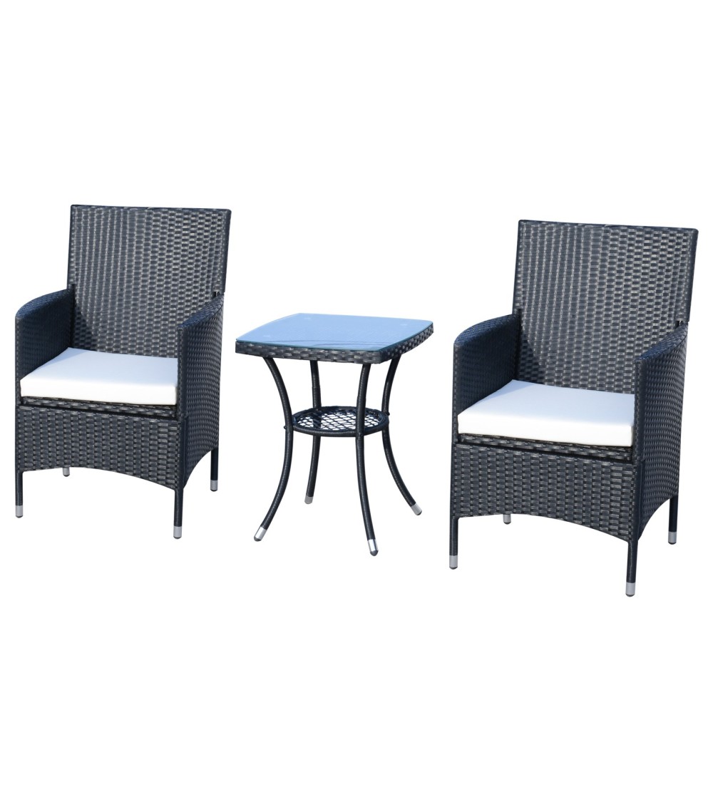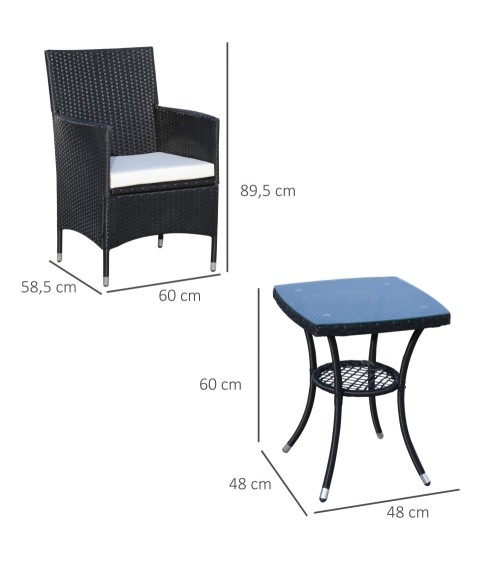 Aimez-vous vivre la nature ? Voulez-vous avoir un salon de jardin en réponse à votre goût pour l'élégance et la modernité ? Etes-vous lassé de votre sofa en cuir ? Alors optez pour ce magnifique salon de jardin qui sublimera votre extérieur !Caractéristiques :- Design intemporel et élégant- Ensemble salon de jardin 2 places composé de 2 fauteuils et d'une table basse carrée- Armature en métal recouvert de poudre epoxy anticorrosion : durée de vie pérenne- Revêtement en résine tressée 4 fils imperméable imitation rotin- Coussins d'assise gris grand confort (tissu polyester 180 g/m²) et déhoussables pour un entretien facile- Rembourrage mousse de 5 cm d'épaisseur et de densité 80 g/m3 pour chacun des coussins- Table basse carrée avec plateau supérieur en verre trempé transparentSpécifications :- Couleur : noir- Matériaux principaux : métal, résine tressée, polyester et mousse- Dimensions fauteuil : 60L x 58,5l x 89,5H cm- Dimensions table basse : 48L x 48l x 60H cm- Profondeur assise : 46 cm- Largeur assise : 45 cm- Hauteur assise (sans coussin) : 40 cm- Charge max. recommandée : 120 Kg (fauteuil) et 50 Kg (table)- Réf. : 863-027BK