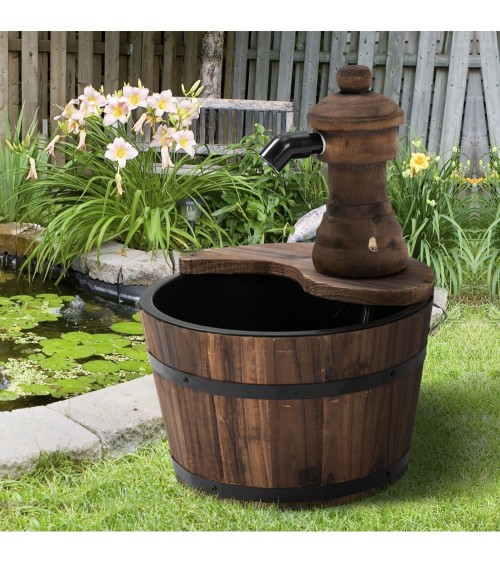 Cette splendide fontaine tonneau à eau fournie avec une pompe (circuit fermé) sublimera votre extérieur ! Elle ajoutera un charme rustique et champêtre très tendance sur votre parterre de fleurs.Caractéristiques :- Fontaine tonneau à eau qui ajoutera un charme rustique et champêtre très tendance sur votre parterre de fleurs- Fontaine en circuit fermé fournie avec une pompe à eau submersible (débit d'eau réglable par simple action sur un bouton)- Moteur à la fois fiable et silencieux pour moins de gêne- Pompe de petite taille qui peut être facilement dissimulée, démontée et nettoyée- Couche de protection intérieure pour l'étanchéité et contre la moisissure- Construction en bois de sapin massif avec une finition brûlée attrayante pour résister aux intempéries- Assemblage facile (manuel illustré fourni) Spécifications :- Couleur : marron- Matériaux principaux : bois massif de pin, métal- Dim. totales : Ø 27 x 37H cm- Dim. tonneau : Ø 27 x 17H cm- Dim. pompe : 13L x 9l x19H cm- Vitesse de rotation de la pompe : 3600 tr/min- Tension : 220-240 V- Fréquence : 50 Hz- Longueur fil d'alimentation : 2 m- Certification norme CE- Livraison en un colis- Réf. : 844-217