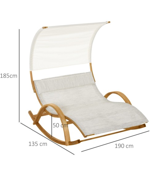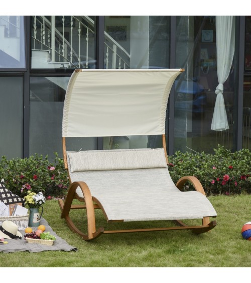 Ce bain de soleil à bascule 2 personnes design contemporain avec pare-soleil et tétière incluse vous permettra de profiter au mieux des beaux-jours. De quoi se prélasser et se bercer au soleil ou à l'ombre en toute quiétude ! Caractéristiques : - Bain de soleil lit de jardin à bascule 2 places design contemporain aux lignes arrondies harmonieuses- Lit double grand confort équipé d'une grande tétière amovible, d'accoudoirs et d'un toit pare-soleil de quoi se prélasser et se bercer au soleil ou à l'ombre en toute quiétude !- Châssis en bois massif de pin pré-huilé robuste : charge max. commandée de 180 Kg, durée de vie pérenne- Toile de toit en polyester haute densité 180 g/m² amovible, anti-UV, imperméable- Revêtement lit en textilène imperméable, résistant à l'humidité (séchage rapide) et anti-UV- Montage rapide (manuel d'assemblage illustré) et entretien facile Spécifications : - Couleurs : bois de pin pré-hulé (châssis), crème chiné (couchage), crème (pare-soleil)- Matériaux principaux : bois massif de pin pré-huilé, textilène, polyester haute densité- Dim. totales : 190L x 135l x 185H cm- Dim. du toit : 174l x 120H cm- Dim. surface couchage : 174l x 135P x 50H cm- Dim. tétière : 115L x 25l x 6H cm- Charge max. recommandée : 180 Kg- Livraison effectuée en un seul colis- Réf. : 84B-543
