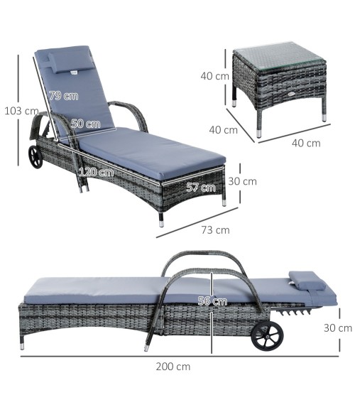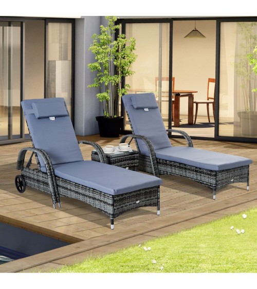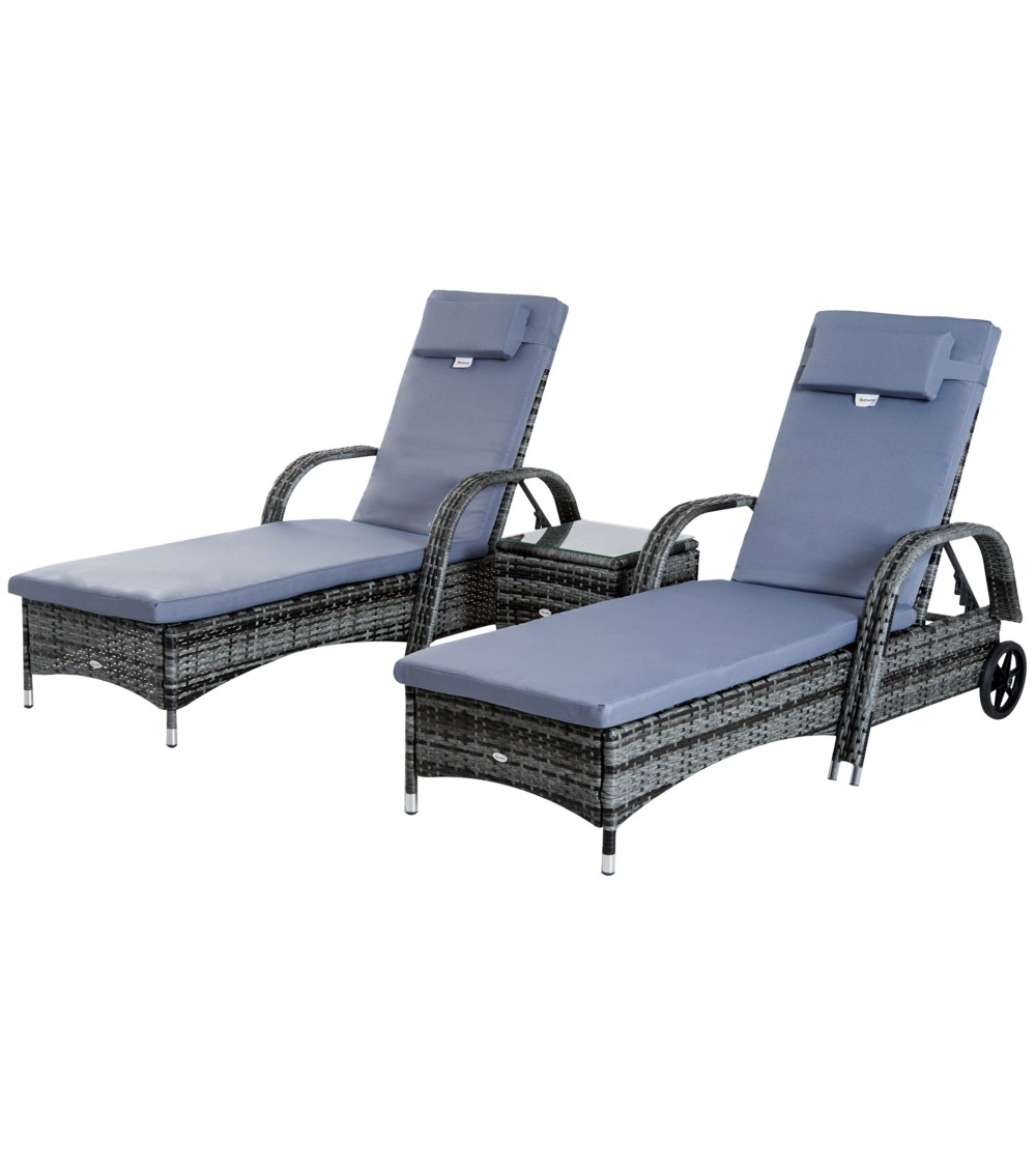 Ce superbe lot de 2 bains de soleil grand confort (matelas, têtière inclus) accompagné d'une jolie table basse avec plateau en verre trempé sublimera votre extérieur ! Doté d'un élégant revêtement en résine tressée grise et confortable (dossier inclinable multipositions, etc...), vous pourrez profiter pleinement des belles journées en duo ! Caractéristiques : - Ensemble de jardin composé d'un lot de 2 bains de soleil grand confort et 1 table basse avec plateau en verre trempé- Structure robuste en métal époxy anticorrosion, revêtement en résine tressée imitation rotin gris : matériaux de qualité résistant aux rayons UV, à l'humidité et ne nécessitant pas d'entretien particulier- Dossier inclinable multipositions (5 au choix) afin de s'adapter à toutes situations : lecture, sieste, bain de soleil- Deux grandes roues arrières facilitant son déplacement si nécessaire- Garnissage mousse haute densité 800 g/² du matelas, housse polyester agréable au toucher- Plateau de table basse haut de gamme en verre trempé 5 mm- Idéal pour installation sur une terrasse, autour d'une piscine, sur un balcon, dans le jardin- Montage facile, rapide à l'aide du manuel d'assemblage illustré fourni- Recommandation : veuillez utiliser une housse de protection si inutilisation Spécifications : - Couleur principale : gris- Matériaux principaux : métal époxy anticorrosion, résine tressée PE imitation rotin, polyester, garnissage mousse, verre trempé- Dim. bains de soleil : 200L x 73l x 72-103H cm- Dim. table basse : 40L x 40l x 40H cm- Dim. assise : 57l x 120P x 30H cm- Dim. accoudoirs : 8L x 56H cm- Dim. dossier : 79L x 50l cm- Hauteur dossier (position à à plat) : 30 cm- Charge max. recommandée : 160 Kg (bain de soleil), 50 Kg (table basse)- Livraison effectuée en 2 colis- Réf. : 862-014V01