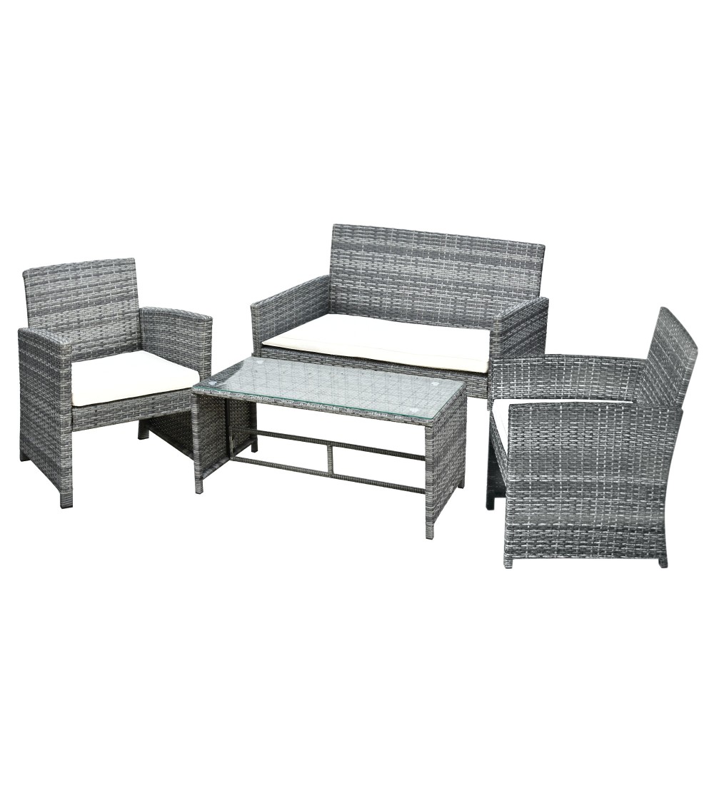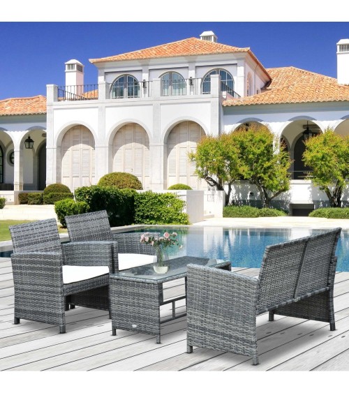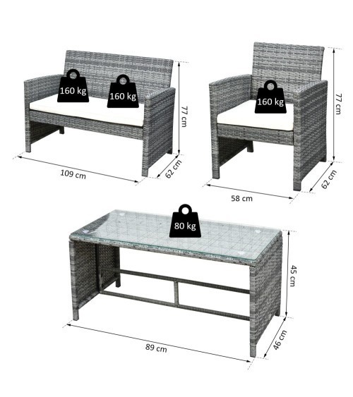 Aimez-vous vivre la nature ? Voulez-vous avoir un salon de jardin en réponse à votre goût pour l'élégance et la modernité ? Etes-vous lassé de votre sofa en cuir ? Alors optez pour ce magnifique salon de jardin qui sublimera votre extérieur ! De quoi épater et installer confortablement votre famille et invités.Caractéristiques :- Design intemporel et élégant- Ensemble salon de jardin 4 places composé d'un canapé, de 2 fauteuils et d'une table basse rectangulaire- Armature en métal recouvert de poudre epoxy anticorrosion- Revêtement en résine tressée imperméable imitation rotin- Coussins d'assise blanc grand confort (tissu polyester 180 g/m²) et déhoussables pour un entretien facile- Rembourrage mousse de 5 cm d'épaisseur et de densité 800 g/m² pour chacun des coussins- Table basse rectangulaire avec plateau supérieur en verre trempé transparentSpécifications :- Couleurs : gris et blanc- Matériaux principaux : métal, résine tressée, polyester et mousse- Dimensions canapé 2 places : 60L x 108l x 77H cm- Dimensions fauteuil 1 place : 60L x 57l x 77H cm- Dimensions accoudoirs : 4l x 57H cm- Dimensions table basse : 75L x 40l x 38H cm- Charge max. recommandée : 160 Kg (fauteuil) / 200 Kg (canapé) et 80 Kg (table)- Réf. : 841-173