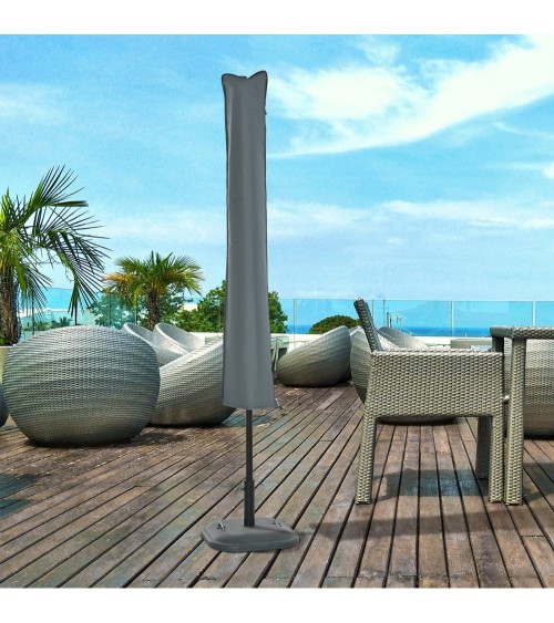 Cette superbe housse de protection imperméable pour parasol droit avec zip et cordon de serrage sera une protection efficace contre les intempéries. Avec l'arrivée des beaux jours mais aussi des orages, cette housse vous deviendra vite indispensable afin de protéger efficacement votre parasol et d'optimiser sa durée de vie !Caractéristiques :- Housse de protection imperméable pour parasol droit- Permet une protection optimale contre les intempéries afin d'optimiser la durée de vie de votre parasol- Fermeture intégrale possible via zip et cordon de serrage- Compatible avec les parasols droits de diamètre compris entre 270 et 300 cm- Fabriqué en polyester oxford 420D imperméable- Vendu sans le parasolSpécifications :- Couleur principale : gris- Convient aux parasols de diamètre compris entre 270 et 300 cm- Matériau principal : polyester oxford imperméable 420D- Dimensions : largeur partie haute : 25 cm; partie basse : 35 cm et hauteur : 178 cm- Réf. : 84B-064