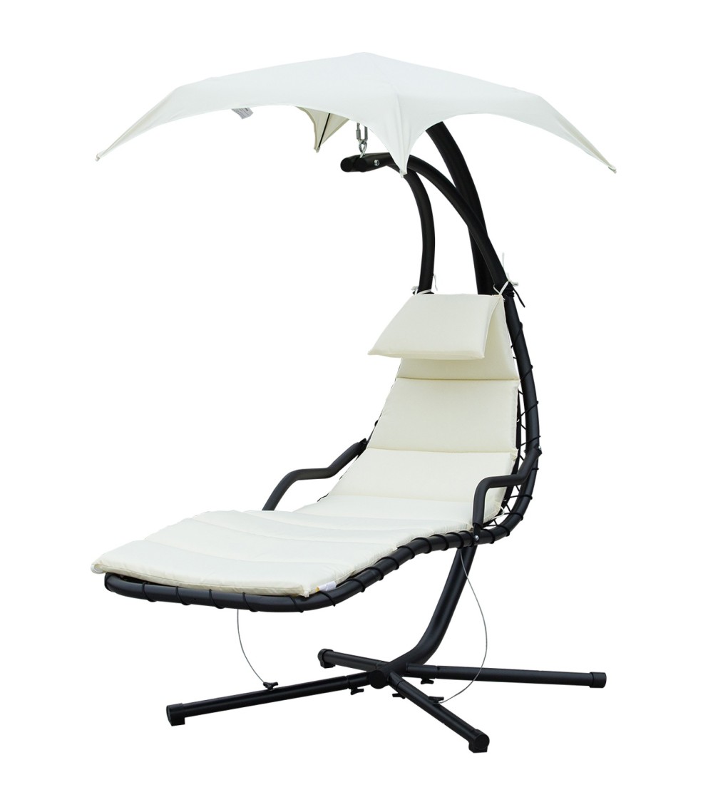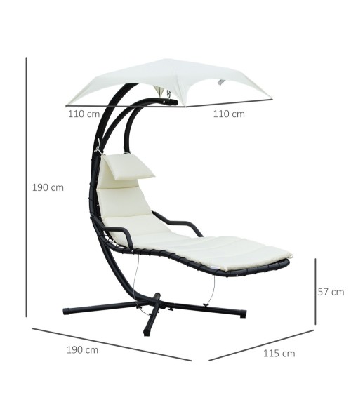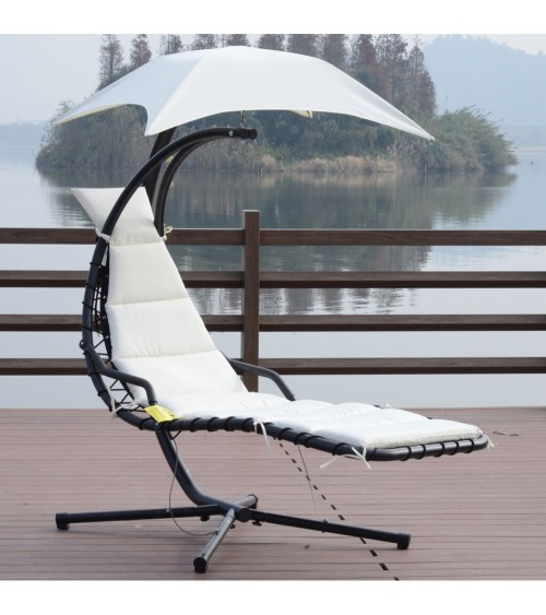 Ce magnifique bain de soleil transat suspendu design contemporain s'integrera parfaitement dans votre jardin ou sur votre terrasse. Son design mélant élégance, sobriété et modernité sera un atout charme et repos supplémentaire de votre extérieur !Caractéristiques :- Bain de soleil transat complet avec support sur pied, matelas et même pare-soleil amovible- Design contemporain sobre et élégant- Structure en tubes d'acier recouvert de poudre epoxy inoxydable, robustesse et pérennité d'utilisation au rendez-vous- Sommier en polyester souple noué au châssis par un réseau de cordons pour un confort inégalable- Accoudoirs avec revêtement mousse : position assise ou allongée très agréable- Matelas et oreiller crème 3,5 cm d'épaisseur polyester 180g/m² fournis- Chassis grande solidité, double cordons stabilisateurs et pieds antidérapants pour une sécurité d'utilisation optimale- Chaine et ressort de suspension acier fournis- Montage et entretien facileSpécifications :- Couleurs : noir et crème- Matériaux principaux : acier, polyester, mousse- Dimensions totales : 194L x 117l x 192H cm- Dimensions pare-soleil : 117L x 119l cm- Hauteur d'assise : environ 52 cm- Epaisseur matelas : 3,5 cm- Diamètres de tubes : 60, 42 et 25 mm- Charge max. recommandée : 100 Kg- Réf. : 84A-042CW