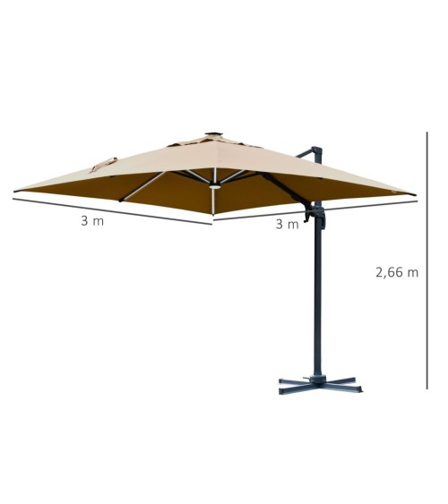 Ce superbe parasol déporté LED est idéal pour profiter entre amis ou en famille de votre extérieur même par forte chaleur ! À la fois pivotant à 360° et inclinable, vous pourrez le régler à votre guise suivant l'heure de la journée et la hauteur du soleil. Pratique et design, cet équipement indispensable de jardin et terrasse vous ravira ! Caractéristiques : - Parasol déporté carré grande taille dim. 3L x 3l x 2,66H m- Parasol design LED alliant modernité et élégance, belle luminosité générée par capteur solaire 2,5 W- Idéal pour profiter d'une grande zone ombragée sur votre terrasse, dans votre jardin ou au bord de votre piscine !- Possibilité d'incliner le parasol à 4 niveaux en fonction de la hauteur du soleil- Parasol pivotant à 360° (par action manette) pour vous protéger du soleil toute la journée- Système d'ouverture et fermeture à manivelle en aluminium : pratique, rapide à ouvrir fermer à votre guise- Équipé de 8 entretoises et mât robuste en aluminium : usage pérenne- Pied en croix : stabilité & sécurité optimums- Toile en polyester haute densité 250 g/m² avec velcro d'attache aux entretoises : protection optimale contre les rayons UV nocifs du soleil- Note : parasol à installer uniquement sur un sol parfaitement plat et à lester (100 Kg min., dalles non fournies)- Recommandation d'usage : il est fortement conseillé de fermer & protéger votre parasol par mauvais temps (pluie, vent, etc...) Spécifications : - Couleur : beige- Matériaux principaux : aluminium, acier, polyester haute densité- Dim. totales : 3L x 3l x 2,66H m- Dim. panneau solaire : 14L x 14l cm (épaisseur : 6,9 cm)- Puissance panneau solaire : 2,5 W- Batterie : 5000 mAh / 3,7 V- Dim. piètement en croix : 100L x 100l x 6H cm- Certifications normes CE-EMC, RoHS, MSDS, UN38,3- Livraison effectuée en un colis- Réf. : 84D-111