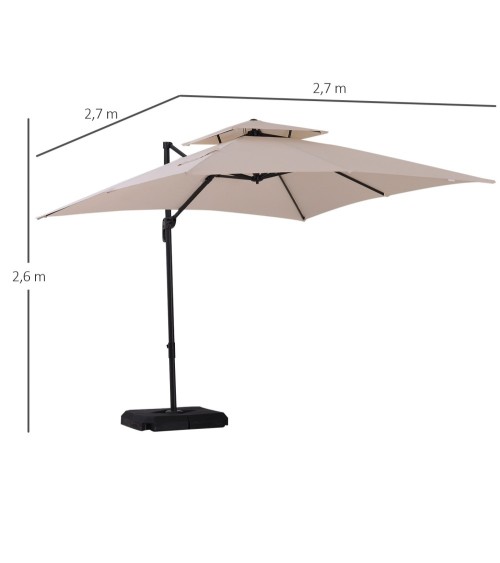 Ce superbe parasol déporté beige inclinable et pivotant est idéal pour profiter entre amis ou en famille de votre extérieur ! Pour vous assurer une utilisation pérenne, ce parasol est composé de 8 baleines qui vous permettront de l'incliner comme vous le souhaitez sans oublier son lestage inclus ! Pratique et design, cet élément indispensable à votre jardin et terrasse vous ravira ! Caractéristiques : - Parasol déporté carré grande taille dim. 2,7L x 2,7l x 2,6H m- Design double toit alliant modernité, sobriété pour plus d'élégance- Idéal pour profiter d'une grande zone ombragée sur votre terrasse, dans votre jardin ou au bord de votre piscine !- Double toit favorisant la ventilation de l'air pour atténuer la sensation d'étouffement par forte chaleur- Possibilité d'incliner le parasol en fonction de la hauteur du soleil (7 positions)- Possibilité également de faire pivoter le parasol suivant la zone que vous souhaitez ombrager- Ouverture et fermeture facile grâce à sa manivelle intégrée- Toile en polyester haute densité 180 g/m² : protection optimale contre les UV50 et- Châssis robuste et stable en acier époxy anticorrosion pour un usage pérenne- Rangement peu encombrant et montage/démontage facile et rapide- Pied en croix pour une stabilité optimale- Base de lestage à remplir avec du sable (env. 25 Kg) ou de l'eau (env. 20 Kg) Spécifications : - Couleur : beige- Matériaux principaux : acier époxy anticorrosion, polyester haute densité 180 g/m²- Dim. totales : 2,7L x 2,7l x 2,6H m- Hauteur mât : 2,58 m- Dim. piètement en croix : 1L x 1l m- Dim. poids de lestage : 40L x 40l cm (épaisseur : 10 cm)- Livraison effectuée en un colis- Réf. : 84D-073V01