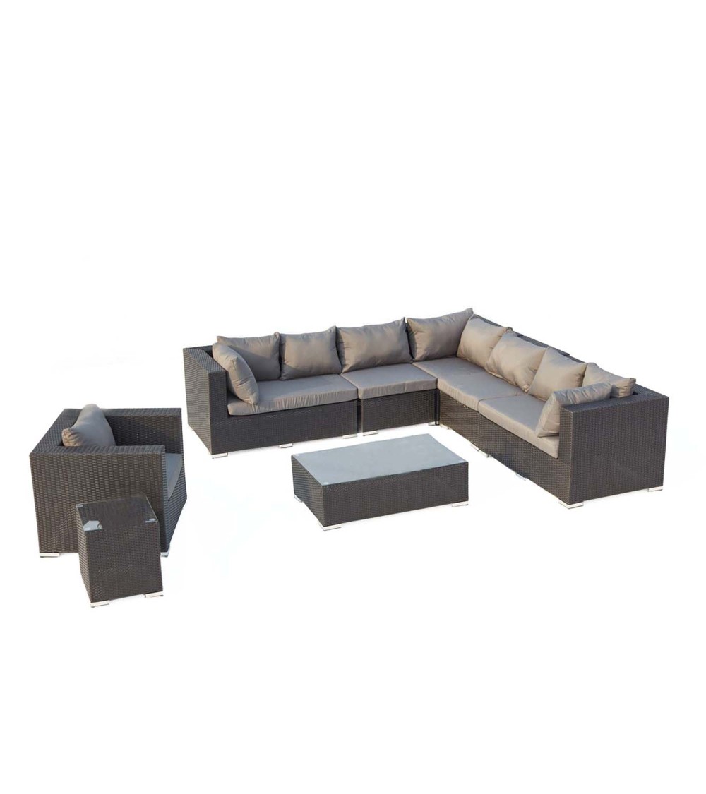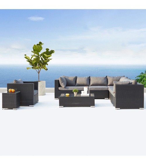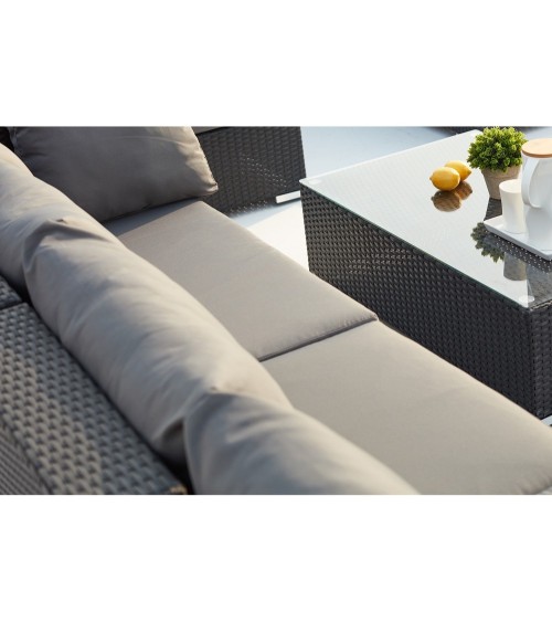 Ressemblant à du rotin, cette nouvelle matière synthétique polyéthylène n'en a que les qualités esthétiques sans les inconvénients : elle résiste aussi bien aux intempéries qu'aux UV, peut être utilisée aussi bien à l'intérieur qu'à l'extérieur ; même sous un climat très ensoleillé et/ou marin, la résine tressée conserve ses qualités esthétiques et structurelles.Caractéristiques Techniques : Type de table : Carré/RectangleNombre de places : 8Couleur principale : NoirCouleur des coussins : GrisMatière : Résine tresséeType de matière : Poly rotin 4 filsStructure : AluminiumType de verre : Verre trempé clairMatière des coussins : 100% PolyesterGarnissage des coussins : 90 % Polyuréthane + 10% PolypropylèneNombre de modules : 8Dimensions :Epaisseur du verre (mm) : 5 mmDimensions globales : 255 x 255 x 66 cmProfondeur d'assise : 62 cmHauteur d'assise : 38 cmHauteur du piètement : 4 cmPoids global : 66,8 kgPoids max supporté : 75 kg (table), 130 kg (canapé)Entretien : Pour un entretien optimal de votre mobilier en résine tressée, nous vous conseillons tout simplement de laver au jet d'eau. Les coussins sont lavables en machine à 40°C, essorage doux.Conditionnement :Produit livré et conditionné dans 2 cartons. Montage facile, notice incluse.