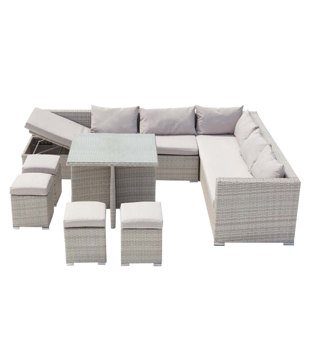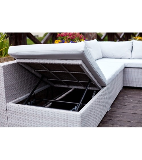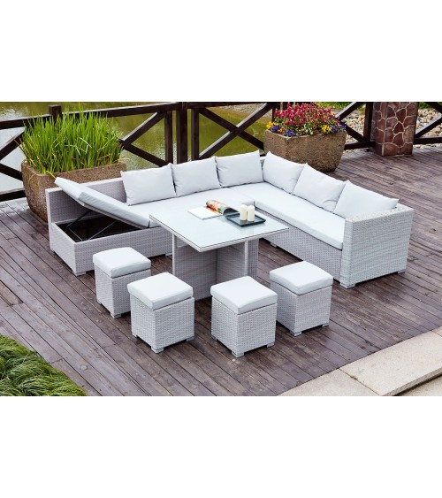 L'ensemble de jardin en résine tressée est composé de 4 petits poufs et d'un grand canapé, de quoi accueillir 10 personnes. Côté confort, le salon est doté d'une assise inclinable qui peut donc se transformer en dossier. Libre à vous ensuite d'utiliser l'espace intérieur du salon pour ranger quelques affaires.Caractéristiques techniques :Salon complet en résine tressée plate 4 filsStructure : acier / 0.8 mmCouleur de la résine : gris clairCouleur des coussins : grisMatière des coussins d'assise : 90% polyuréthane/ 10% polypropylèneMatière des coussins dorsaux : 100% polypropylèneCoussins déhoussables en tissu imperméableArmature métallique recouverte de peinture époxyDimensions :Table : 85 x 85 x 68 cm / 13.5 kgCanapé avec accoudoir : 220 x 75 x 65 cm / 26.5 kgCanapé inclinable : 198 x 75 x 65 cm / 24.6 kgPouf : 35 x 35 x 43 cm / 2.6 kgConseils d'entretien :Pour un entretien optimal de votre mobilier en résine tressée, nous vous conseillons de le laver à l'aide d'une éponge et d'eau claireLes coussins sont lavables en machine à 40°C, essorage doux.Conditionnement :Produit conditionné dans 2 cartons :Colis 1 de 200 x 70 x 57 cm / 45 kgColis 2 de 87 x 87 x 70 cm / 30 kg Livré non monté. Montage facile avec notice incluse! * Livraison pas de porte* Garantie 2 ans