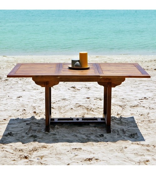 Exotique et moderne, habillez votre jardin de cette table en teck huilé ! D'une largeur de 100 cm et d'une longueur réglable de 120 à 170 cm grâce à une rallonge papillon, cette table peut accueillir jusqu'à 8 convives ! En teck huilé, elle nécessite peu d'entretien et résiste aux intempéries. Fonctionnelle, cette table rectangulaire en teck huilé est équipée d'un trou permettant d'accueillir un parasol. Organisez votre salon de jardin en accompagnant cette table de chaises ou de fauteuils de jardin en teck huilé ! Caractéristiques : Matière : Teck huilé - Couleur : Marron - Longueur 120/170 cm x largeur 100 cm x Hauteur 75 cm - Poids : 35 kg - Garantie : 1 an - Montage : pieds à assembler. Les + : Visserie laiton Rallonge papillon de 50 cm Trou de parasol - Épaisseur de plateau 3 cm.