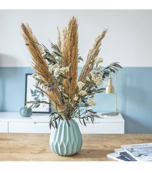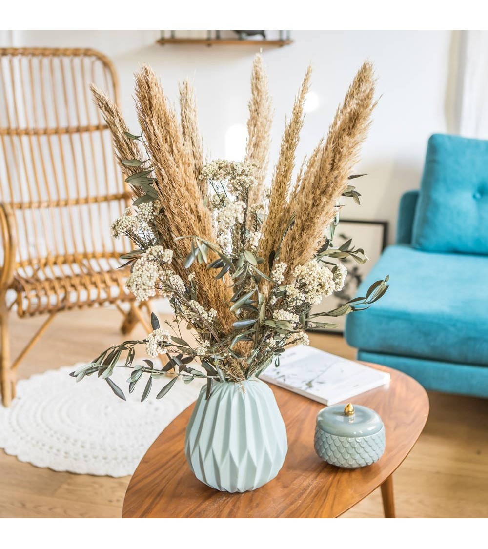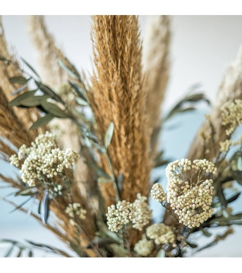 Saviez-vous que la production d'une seule rose émet autant de CO2 qu'un trajet de 5km en voiture ? Limitez votre consommation de fleurs fraîches en choisissant un bouquet de fleurs qui dure.Les grandes tiges de miscanthus naturel donnent tout son caractère champêtre à ce bouquet de fleurs séchées. Le blanc des fleurs de diosmi illuminent le cur tandis que les feuilles dolivier provençal renforcent encore plus son côté naturel.Ce bouquet de fleurs séchées fait pour durer, réveillera à coup sûr votre décoration dintérieur.Composition du bouquet : Diosmi blanc Miscanthus naturel Branches dolivier ProvençalTaille du bouquet : Hauteur env. 70 cm Diamètre env. 45 cmNos conseils dentretien :Nos bouquets de fleurs séchées sont faits pour durer. En appliquant nos conseils, vous pourrez les conserver de nombreuses années.1. Placez votre bouquet de fleurs séchées à labri de la lumière directe du soleil : En effet, une exposition longue et répétée affadira ses couleurs dorigine.2. Méfiez-vous des courants dair : Lassèchement rend les fleurs beaucoup plus fragiles. Un mouvement brusque ou un courant dair peut faire senvoler les pétales de vos fleurs séchées. Pensez-y !
