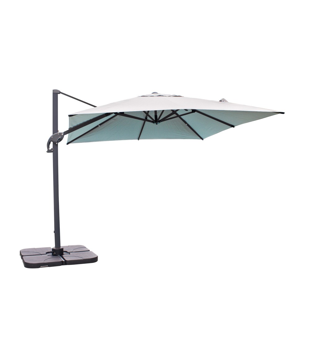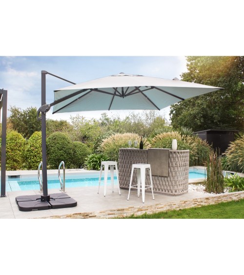Produit à usages professionnels et particuliers. Parasol avec toile déperlante rectangulaire en polyester imperméabilisé gris. Mât en aluminium gris. Pied excentré en acier. Système d'ouverture/fermeture par manivelle. Rotation à 360° grâce à une pédale. Inclinaison de la toile possible grâce à une poignée. Dalles de parasol vendues séparémentDIMENSIONSToile : L 250 x l 250 x H 265 cmRayon du socle : 48,5 cm Hauteur socle : 6 cmChoisissez le parasol professionnel P-25 pour aménager votre terrasse.