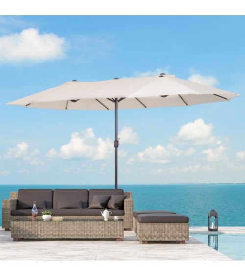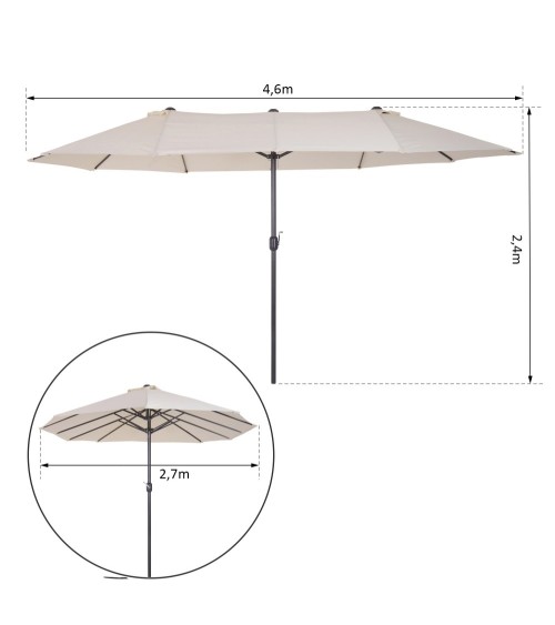 Description : Ce grand modèle de parasol en acier et polyester haute densité couvrant une longueur totale de 4,6 m vous offrira une protection optimale contre le soleil. Vous pourrez ainsi profiter de votre extérieur en famille ou entre amis sans être dérangé pas les rayons intenses du soleil en plein été !Caractéristiques :- Grand parasol idéal pour ombrager une grande zone dans votre jardin, patio, terrasse, piscine, etc- Parasol XXL avec grande surface de protection contre le soleil- Excellente circulation d'air sous le parasol- Composé de 12 entretoises en métal pour un maximum de stabilité- Manivelle d'ouverture fermeture en alliage d'aluminium : fonctionnement pratique et facile au quotidien- Tissu polyester haute densité 180 g/m² : protection idéale contre le soleil- Mât en acier haute qualité démontable en 2 pièces : transport et rangement plus pratique- Montage facile à l'aide du manuel d'assemblage illustré fourni- Note: base/socle de parasol non inclusSpécifications : - Couleur : crème- Matériaux principaux: acier, alliage d'aluminium, polyester 180 g/m²- Diamètre latérale du parasol: 2,7 m- Longueur totale: 4,6 m- Hauteur totale: 2,4 m- Diamètre tubulaire mât: 4,8 cm- Livraison effextuée dans un colis- Réf. : 84D-030V01CW