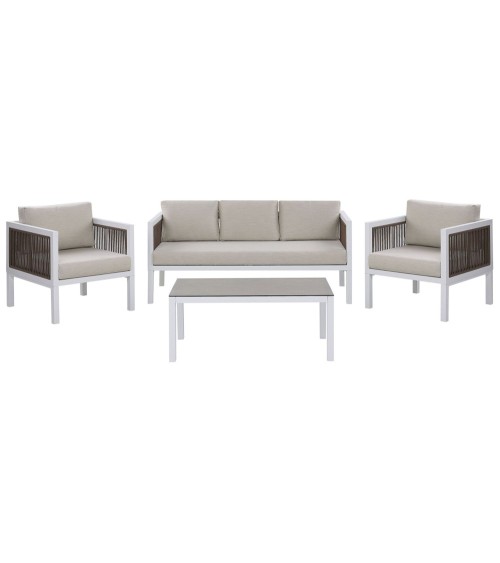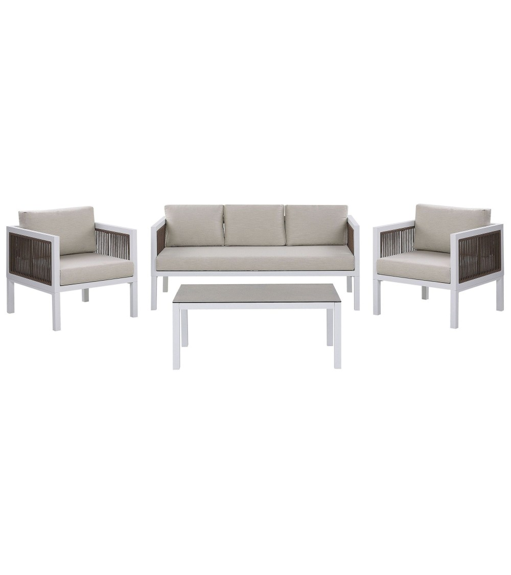 Offrez-vous des moments ensoleillés dans le confort absolu ! Ce superbe salon de jardin se compose d'un canapé 3 places et 2 fauteuils assortis, accompagnés d'une table basse avec plateau en verre de sécurité. Ces meubles d'extérieur sont entièrement fabriqués en aluminium de couleur blanche, avec éléments décoratifs marron, et dotés de coussins d'assise et de dossier moelleux, déhoussables et lavables. Élégant et très comfy, ce salon de jardin deviendra le point phare de votre terrasse ou jardin et vous permettra de profiter à 100% de la détente en plein air.