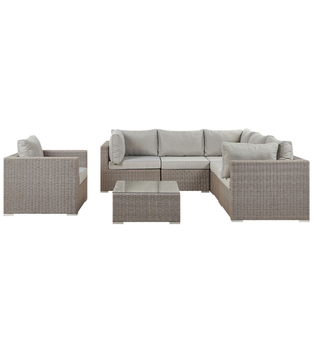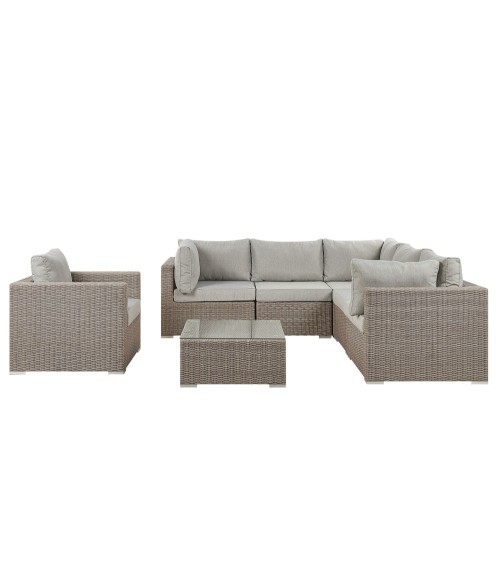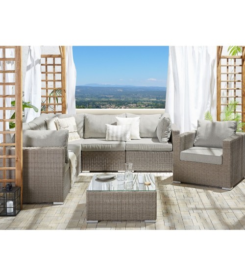 Ce salon de jardin en rotin PE beige taupe avec coussins gris clair, offre un luxe intemporel avec une touche estivale et permet daccueillir 6 personnes. Installez-vous confortablement sur le fauteuil de jardin épais ou sur le grand canapé d'angle modulable composé de 5 pièces (3 sièges d'angle et 2 sièges sans accoudoirs) individuelles qui peuvent aussi bien être utilisées séparément ou facilement réagencées pour former le canapé de votre choix. En effet ce salon d'extérieur vous offre de nombreuses possibilités d'aménagement et de combinaisons.
