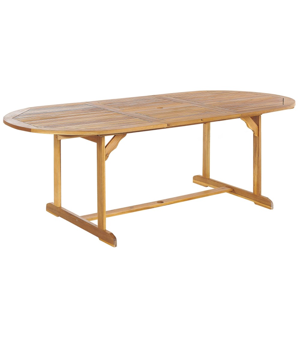 Cette table est le complément idéal de tout patio, quel que soit son style. Fabriquée en bois d'acacia tous temps, elle est à la fois durable et facile à entretenir. Conçu avec des panneaux papillons, le plateau peut être étendu rapidement et facilement, et lorsque les panneaux sont cachés, la table ne prend pas trop de place. Elle est également dotée d'un trou prédécoupé pour accueillir un mât de parapluie lorsque vous préférez l'ombre au soleil.