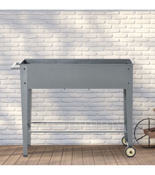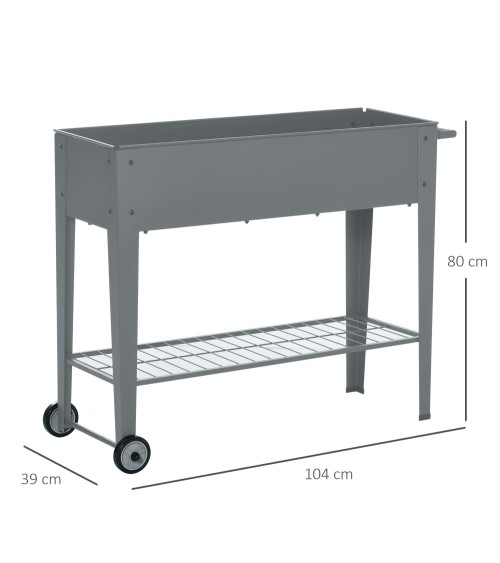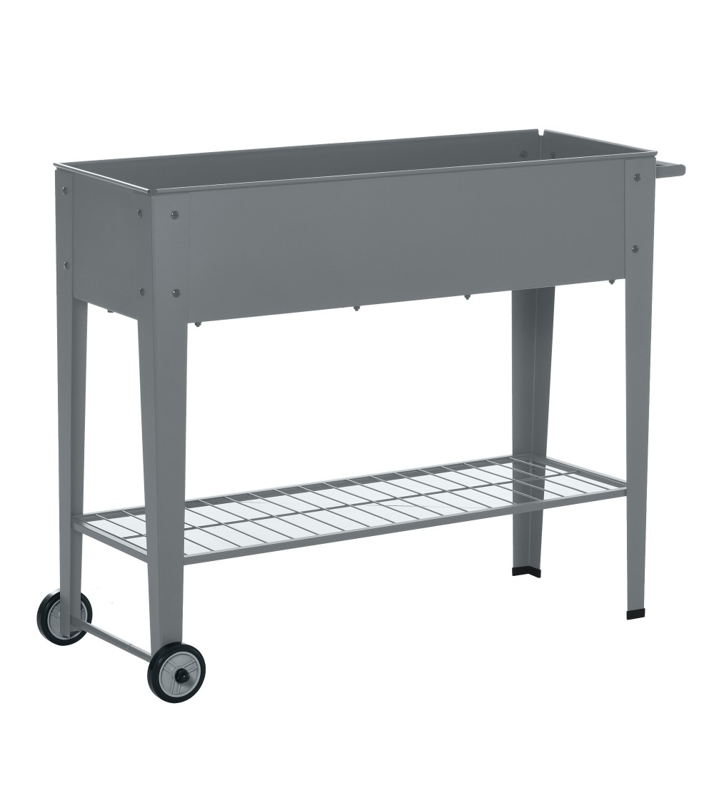 Cette splendide jardinière sur pieds en métal avec étagère et roulettes vous permettra de faire vos plantations de légumes, plantes aromatiques ou fleurs sans avoir à vous baisser. Compacte et très élégante, elle s'intègrera parfaitement sur votre balcon, terrasse, patio ou jardin. Caractéristiques : - Jardinière potager sur pieds idéal pour jardiner à domicile sans avoir à se baisser- Potager permettant de faire pousser tous types de plantations (légumes, plantes aromatiques ou fleurs) sans ajout d'insecticide- Etagère inférieur pouvant servir d'espace de rangement (pour vos outils de jardinage) ou de décoration (pots de fleurs)- Déplacement facile, pratique si besoin : 2 roues et poignée latérale- Conçu et fabriqué en métal anti-UV et antigel : usage pérenne- Charge max. recommandée de 50 Kg- Insert d'irrigation inclus dans le fond de la jardinière- Montage simple, rapide : manuel d'assemblage et d'utilisation illustré fourni Spécifications : - Couleur : gris- Matériaux principaux : métal, PP- Dim. totales : 104L x 39l x 80H cm- Dim. potager : 95L x 35l x 20H cm- Dim. étagère : 94L x 34l cm- Hauteur étagère du sol : 20 cm- Charge max. recommandée : 50 Kg (au total), 15 Kg (étagère)- Livraison effectuée en un colis- Réf : 845-384GY