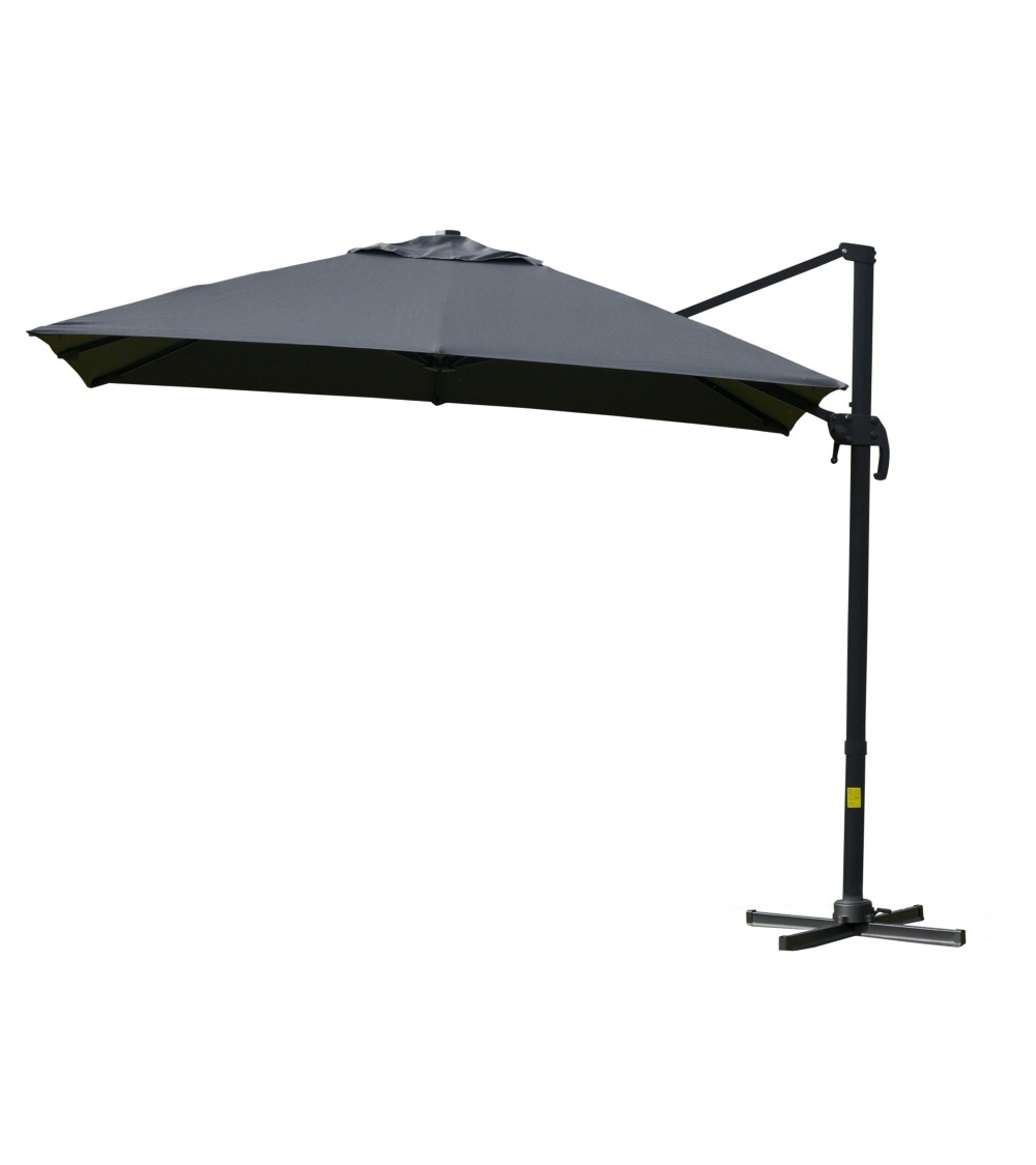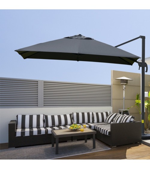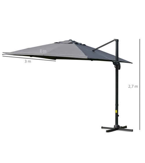 Cet élégant parasol déporté est idéal pour profiter entre amis ou en famille de votre extérieur même par forte chaleur ! À la fois pivotant à 360° et inclinable, vous pourrez le régler à votre guise suivant l'heure de la journée et la hauteur du soleil. Pratique et design, cet équipement indispensable de jardin et terrasse vous ravira ! Caractéristiques : - Parasol déporté carré grande taille dim. 3L x 3l x 2,7H m- Parasol design alliant modernité et élégance- Idéal pour profiter d'une grande zone ombragée sur votre terrasse, dans votre jardin ou au bord de votre piscine !- Possibilité d'incliner le parasol à 4 niveaux en fonction de la hauteur du soleil- Parasol pivotant à 360° (par action manette) pour vous protéger du soleil toute la journée- Système d'ouverture et fermeture à manivelle en aluminium : pratique, rapide à ouvrir fermer à votre guise- Équipé de 8 entretoises et mât robuste en aluminium : usage pérenne- Pied en croix : stabilité & sécurité optimums- Toile en polyester haute densité 250 g/m² avec extrémités entretoises zippées : protection optimale contre les rayons UV nocifs du soleil- Note : parasol à installer uniquement sur un sol parfaitement plat et à lester (100 Kg min., dalles non fournies)- Recommandation d'usage : il est fortement conseillé de fermer & protéger votre parasol par mauvais temps (pluie, vent, etc...) Spécifications : - Couleur : gris- Matériaux principaux : aluminium, acier, polyester haute densité- Dim. totales : 3L x 3l x 2,7H m- Dim. piètement en croix : 100L x 100l x 6H cm- Certifications normes CE-EMC, RoHS, MSDS, UN38,3- Livraison effectuée en un colis- Réf. : 84D-112CG