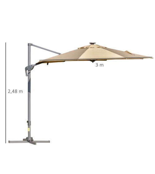 Ce superbe parasol déporté LED est idéal pour profiter entre amis ou en famille de votre extérieur même par forte chaleur ! À la fois pivotant à 360° et inclinable, vous pourrez le régler à votre guise suivant l'heure de la journée et la hauteur du soleil. Pratique et design, cet équipement indispensable de jardin et terrasse vous ravira ! Caractéristiques : - Parasol déporté octogonal grande taille dim. Ø 3 x 2,48H m- Parasol design LED alliant modernité et élégance, belle luminosité LED intégrée dans chaque entretoise et générée par capteur solaire 1,6 W (interrupteur inclus)- Idéal pour profiter d'une grande zone ombragée sur votre terrasse, dans votre jardin ou au bord de votre piscine !- Possibilité d'incliner le parasol à 4 niveaux en fonction de la hauteur du soleil- Parasol pivotant à 360° (par action pédale) pour vous protéger du soleil toute la journée- Système d'ouverture et fermeture à manivelle en aluminium : pratique, rapide à ouvrir fermer à votre guise- Équipé de 8 entretoises et châssis robuste en aluminium et métal époxy anticorrosion : usage pérenne- Pied en croix : stabilité & sécurité optimums- Toile en polyester haute densité 180 g/m² : protection optimale contre les rayons UV nocifs du soleil- Note : parasol à installer uniquement sur un sol parfaitement plat et à lester (90 Kg min., dalles non fournies)- Recommandation d'usage : il est fortement conseillé de fermer & protéger votre parasol par mauvais temps (pluie, vent, etc...) Spécifications : - Couleur : beige- Matériaux principaux : aluminium, acier, polyester haute densité- Dim. totales : Ø 3 x 2,48H m- Dim. mât : 6,8L x 5l cm- Dim. entretoises : 1,3L x 2 cm- Dim. base de parasol : 100L x 100l x 6H cm- Dim. panneau solaire : 12L x 10l cm- Puissance : 1,6 W- Tension : 3,7 V- 3 piles AA rechargeables : 2000 mAh / 1,2 V- Certifications normes : CE-EMC, RoHS, MSDS- Livraison effectuée en un colis- Réf. : 84D-110