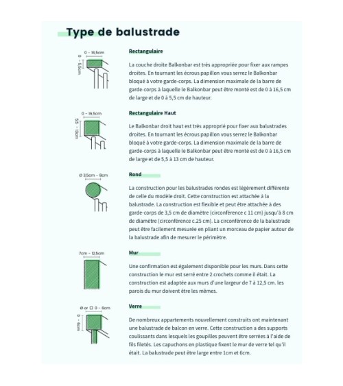 Le Balkonbar est un outil pratique et facile à utiliser, voir notre tutoriel vidéo. Le kit se compose d'un ensemble de planches, d'un support et de matériel de fixation. La Balkonbar mesure 90 cm de long, 30 cm de large et dépasse d'environ 15 cm la balustrade de votre balcon à lavant et à larrière. Le Balkonbar un produit très durable, qui ne nécessite que peu d'entretien. Type de balustrade : Verre : De nombreux appartements nouvellement construits sont maintenant dotés d'une balustrade de balcon en verre. Cette construction est dotée de supports coulissants dans lesquels des goupilles peuvent être serrées à laide de fils filetés. Les capuchons en plastique fixent en quelque sorte la paroi en verre. La balustrade peut avoir une largeur comprise entre 1 et 6 cm.