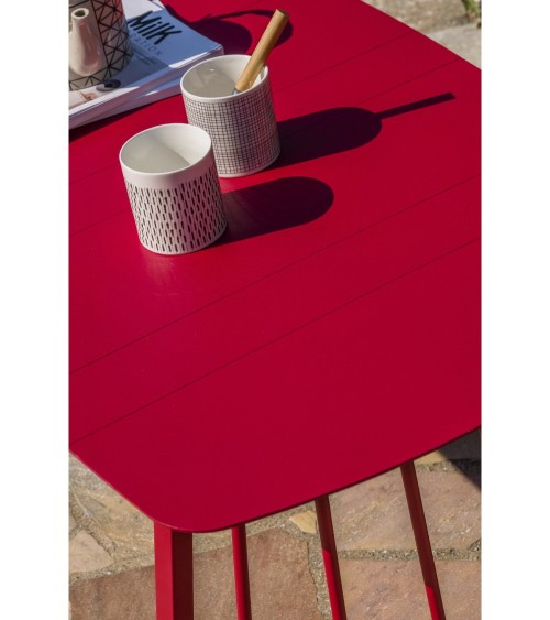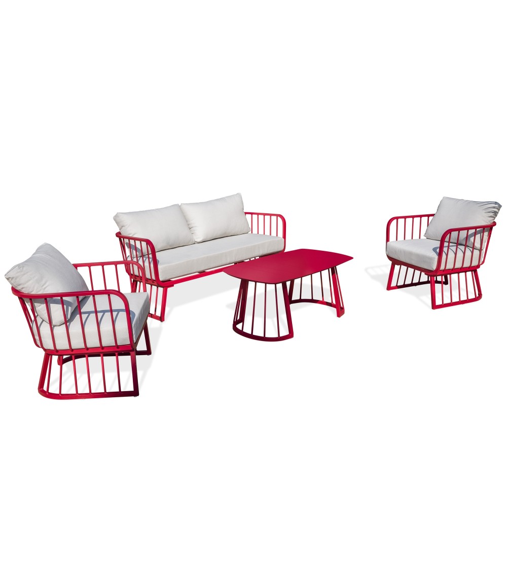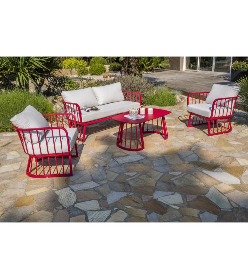Salon de jardin 4 places en aluminium framboise, composé d'un canapé 2 places, de 2 fauteuils et d'une table basse. Coussins déhoussables en toile 100% polyester gris.DIMENSIONSCanapé 2 places : L 150 x l 72 x H 64 cmFauteuil : L 70 x l 68 x H 64 cmHauteur sol-assise : 31 cmCoussin : 11 cm d'épaisseurTable basse : L 100 x l 60 x H 45 cmPlateau de table : 4 mm d'épaisseur