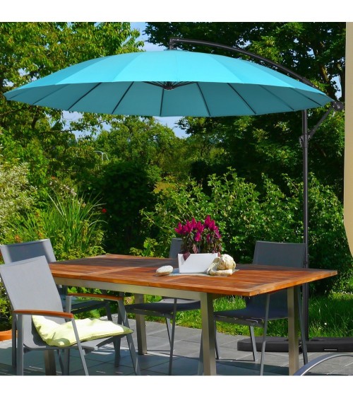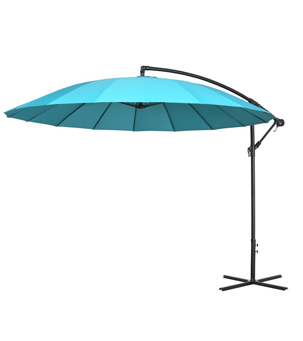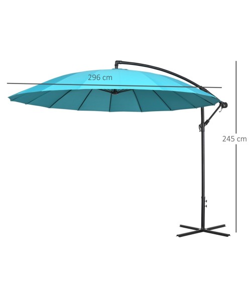 Cet élégant parasol déporté rond est idéal pour profiter entre amis ou en famille de votre extérieur ! Pour vous assurer une utilisation pérenne, ce parasol est composé d'un piètement et mât en métal robuste qui vous permettront de l'incliner comme vous le souhaitez. Pratique et design, cet élément indispensable à votre jardin et terrasse vous ravira ! Caractéristiques : - Parasol déporté rond grande taille diamètre 2,96 m et hauteur 2,45 m- Design alliant modernité et élégance- Parasol idéal pour profiter d'une grande zone ombragée sur votre terrasse, dans votre jardin ou au bord de votre piscine !- Possibilité d'incliner le parasol en fonction de la hauteur du soleil- Ouverture et fermeture facile grâce à sa manivelle intégrée- Toile en polyester haute densité 180 g/m² vous offrant une protection optimale contre les rayons UV nocifs du soleil- Parasol disposant également d'une cheminée pour éviter les prises au vent et pour limiter la stagnation de l'air sous la toile- Conception, fabrication de la structure avec des matériaux de qualité : piètement croix et mât en métal d'une grande stabilité, baleines en fibre de verre- Montage facile, rapide à l'aide du manuel d'assemblage illustré fourni- NOTE : parasol à installer uniquement sur un sol parfaitement plat et à lester (dalles non fournies, dalles recommandées d'un poids total de 60 Kg minimum) Spécifications : - Couleur principale : bleu ciel- Matériaux principaux : métal, tissu polyester haute densité, fibre de verre- Dim. totales : Ø 296 x 245H cm- Dim. mât : 4,8 cm- Dim. base en croix : 100L x 100l cm- Livraison effectuée en un colis- Réf. : 84D-118GN