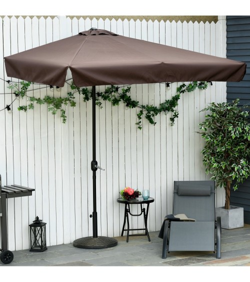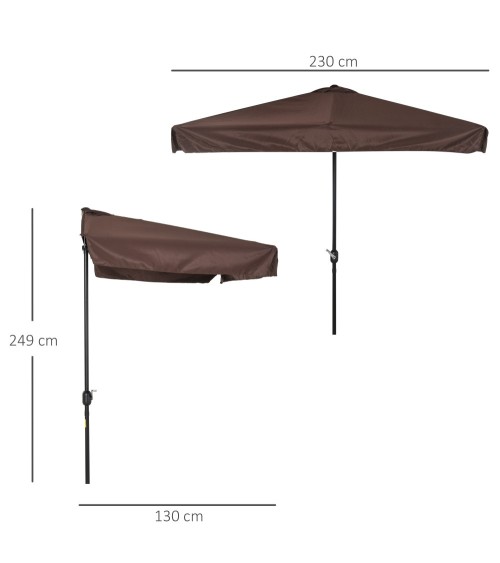 Ce demi-parasol de balcon mélant originalité et élégance vous permettra de profiter pleinement de l'espace de votre balcon ou terrasse. Afin de faciliter son utilisation, son mât peut se démonter en 2 afin de le transporter et de le ranger aisément. Particulièrement simple à ouvrir ou fermer, grâce à sa manivelle, l'installer et le ranger ne vous prendra que quelques secondes. Caractéristiques : - Demi-parasol idéal pour une utilisation sur votre balcon ou terrasse- Parasol demi-cercle à placer le long d'un mur pour une optimisation de votre espace- Ouverture fermeture très facile par mouvement de la manivelle - Mât en métal 2 parties pour un déplacement et rangement pratique et facile- 5 entretoises robustes en métal, rigidité et stabilité optimales- Toile en polyester haute densité 180 g/m² vous offrant une protection optimale contre les rayons UV nocifs du soleil- Parasol disposant également d'une cheminée pour éviter les prises au vent et pour limiter la stagnation de l'air sous la toile- NOTE : parasol à installer uniquement sur un sol parfaitement plat et à lester (pied/dalles non fournies, pied/dalles recommandées d'un poids total de 15 Kg minimum) Spécifications : - Couleur principale : chocolat- Matériaux principaux : métal, polyester haute densité- Dim. totales : 2,3L x 1,3l x 2,49H m- Longueur lambrequin : 20 cm- Hauteur lambrequin (jusqu'au sol) : 190 cm- Diamètre mât : 3,8 cm- Livraison effectuée en un colis- Réf. : 84D-008V01