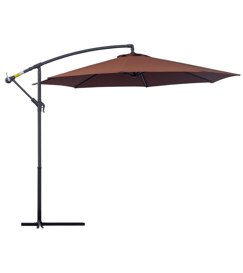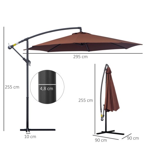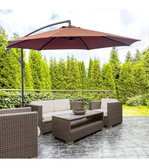 Cet élégant parasol déporté est idéal pour profiter entre amis ou en famille de votre extérieur ! Pour vous assurer une utilisation pérenne, ce parasol est composé de 8 entretoises qui vous permettront de l'incliner comme vous le souhaitez. Pratique et design, cet élément indispensable à votre jardin et terrasse vous ravira ! Caractéristiques : - Parasol déporté grande taille diamètre 3 m et hauteur 2,6 m- Design alliant modernité et élégance- Idéal pour profiter d'une grande zone ombragée sur votre terrasse, dans votre jardin ou au bord de votre piscine !- Possibilité d'incliner le parasol en fonction de la hauteur du soleil- Ouverture et fermeture facile grâce à sa manivelle intégrée- Toile en polyester imperméabilisé haute densité 180 g/m² pour un usage pérenne- Châssis robuste et stable en métal époxy anticorrosion- Rangement peu encombrant et montage/démontage facile et rapide- Pied en croix pour une stabilité optimale- NOTE : parasol à installer uniquement sur un sol parfaitement plat Spécifications : - Couleurs principales : chocolat, noir- Matériaux principaux : métal époxy anticorrosion, polyester haute densité imperméabilisé- Dimensions totales : Ø3 x 2,6H m- Diamètre châssis tubulaire : 4,8 cm- Dimensions pied de parasol : 100L x 10l x 4,6H cm- Réf. : 01-0585