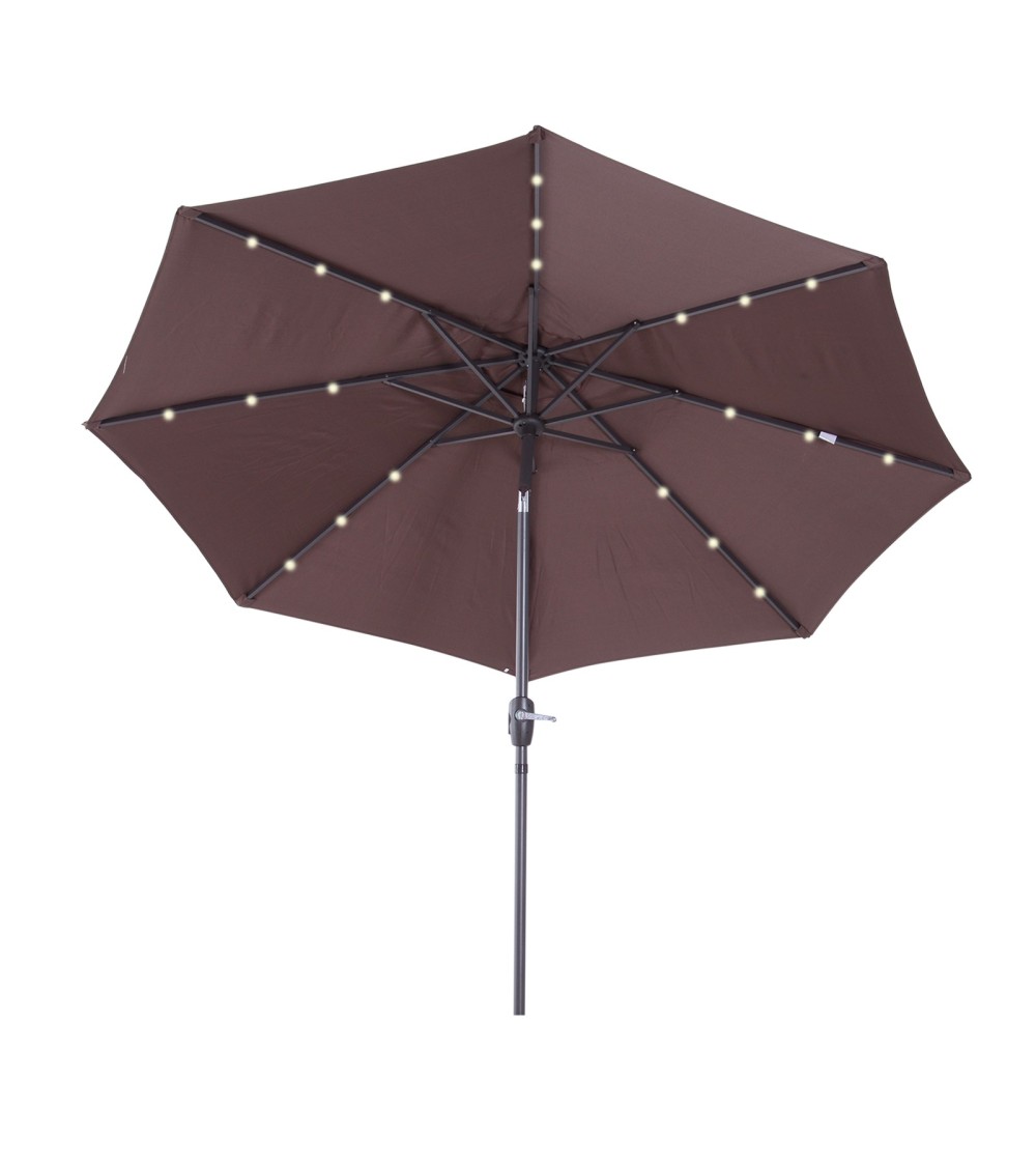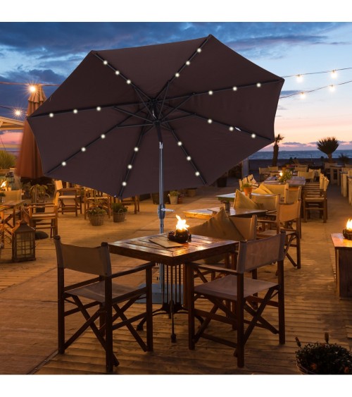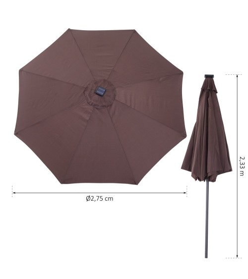Ce magnifique parasol octogonal inclinable solaire vous offrira une protection optimale contre le soleil mais pas seulement ! Doté d'un éclairage solaire LED, vous pourrez profiter de l'ombre du parasol et de sa belle lumière (4 couleurs au choix) une fois le soleil tombé ! Caractéristiques : - Grand parasol idéal pour ombrager une grande zone dans votre jardin, patio, terrasse, piscine, etc...- Capteur solaire pour éclairage LED de toile (au nombre de 24, 3 par entretoise)- éclairage LED 4 couleurs au choix (rouge, bleu, vert, blanc) par simple activation des boutons de contrôle- Parasol inclinable pour une protection optimale contre le soleil à n'importe quelle heure de la journée quelle que soit la hauteur du soleil- Toile en polyester haute densité 180 g/m² : protection idéale contre le soleil- Système d'ouverture et fermeture à manivelle en aluminium : pratique, rapide à ouvrir fermer à votre guise- Mât en métal démontable en deux parties : transport et rangement pratique- Equipé de 8 entretoises robustes en métal pour un usage pérenne- Note : base/socle de parasol non inclus. L'éclairage LED peut être utilisé environ 3 heures en continu après une charge complète !- Recommandation d'usage : il est fortement déconseillé de ne pas laisser votre parasol à l'extérieur par mauvais temps (pluie, vent, neige ou grêle) Spécifications : - Couleurs principales : chocolat (toile), noir (mât)- Matériaux principaux : métal époxy, polyester haute densité 180 g/m²- Diamètre parasol : 2,75 m- Hauteur parasol : 2,33 m- Diamètre mât : 3,8 cm- Nombre total de LED : 24 (puissance 1,2 W)- Certification norme CE- Livraison effectuée en un colis- Réf. : 840-125CF