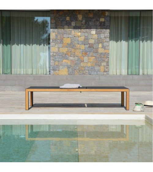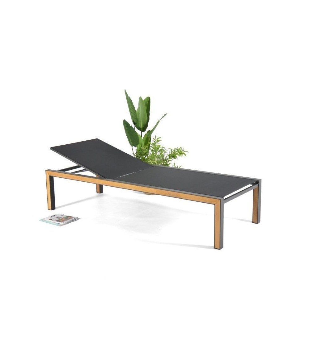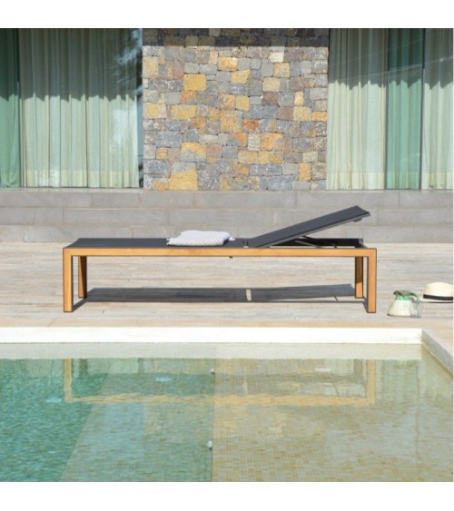 Bain de soleil haut en aluminium finition en bois de teck. Une chaise longue de jardin avec une assise haute. Pratique et jolie, elle trouvera sa place sur votre terrasse pour profiter des belles journées dété. Dimensions : L200 x l79 x H42 cm. Matières : structure en aluminium et teck, assise et dossier en textilène. Dossier inclinable en 5 positions. Bois FSC provenant de forêts aménagées de façon durable. Poids max : 120 kg. Pensez à protéger votre bain de soleil grâce aux housses de protection Aerocover.