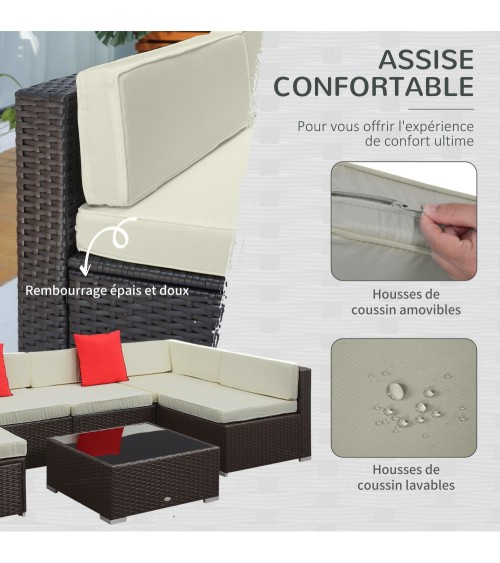 Caractéristiques :- Ensemble salon de jardin complet 6 personnes doté d'un total de 7 pièces : 4 fauteuils, 2 éléments fauteuil d'angle, 1 table basse- Design contemporain style cosy mêlant élégance et sobriété- Salon de jardin d'une grande modularité, 4 dispositions au choix : en U, en face à face, en angle de 2 façons- S'intègre parfaitement à tout type d'extérieur- Ensemble des coussins épais avec garnissage mousse haute densité (160 g/m² au niveau de l'assise, 140 g/m² au dossier) fournis : 6 coussins d'assise, 8 coussins de dossier, 2 coussins décoratifs- Entretien pratique et facile : ens. des coussins déhoussables, tissu de qualité (revêtement doublé en polyester haute densité 200 g/m² imperméabilisé) : rembourrage mousse préservé de l'humidité pour un séchage rapide- Revêtement en résine tressée imitation rotin : matériaux de qualité résistant aux rayons UV, à l'humidité et ne nécessitant pas d'entretien particulier- Structure robuste en métal époxy anticorrosion pour un usage pérenne- Grand plateau de table basse en verre trempé épaisseur 5 mm- Stabilité accrue grâce aux pieds de nivellement antidérapants individuellement réglables - Piètement imitation métal chromé pour plus de raffinement- Montage facile à l'aide du manuel d'assemblage illustré fourni Spécifications :- Couleurs : brun foncé, crème, rouge- Matériaux principaux : métal époxy, résine PE, verre trempé, polyester, mousse- Dim. canapé intermédiaires : 75L x 65l x 62,5H cm- Dim. canapé angle : 75L x 75l x 62,5H cm- Dim. table basse : 73L x 65l x 32H cm- Prof. assise : 65 cm- Haut. assise : 32,5 cm (sans coussin)- Larg. assise : 65 cm- Dim. accoudoirs : 10l x 63H cm- Dim. coussins déco. : 40L x 40l cm- Ép. verre trempé : 5 mm- Acc. fournis : 6 coussins d'assise, 8 coussins de dossier, 2 coussins déco.- Charge max. recommandée : 160 Kg (1 place), 70 Kg (table basse)- Livraison effectuée en 3 colis- Réf. : 860-020