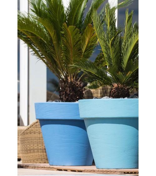 Serralunga 1825 propose une vaste gamme de cache-pots et de pots pour l'extérieur. Bordato Liscio créé des formes basiques, chaleureuses et es surfaces marquées par une légère texture portant la saveur et la tradition, pour un effet certes rural mais composé. Interprétation moderne du vase classique par excellence, la série de cache-pots Bordato Liscio est la solution idéale pour n'importe quel environnement, interne et externe, terrasses et jardins. Son effet esthétique est mis en valeur avec son fini original « rayé » caractérisant les couleurs traditionnelles proposées. Ce pot est également proposé dans la version lumineuse. Couleur bleu Provence.
