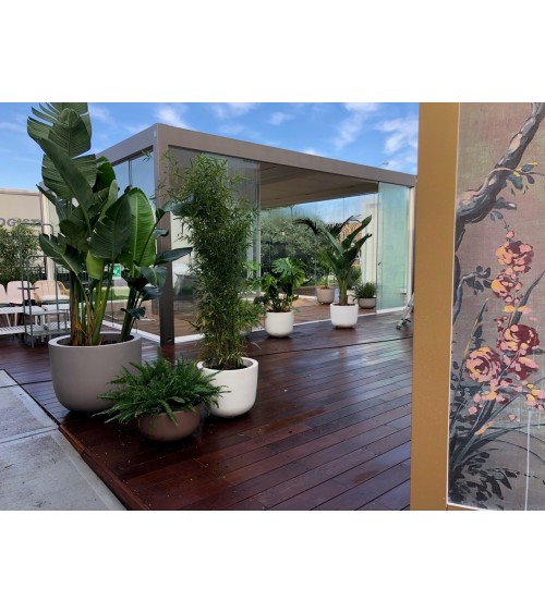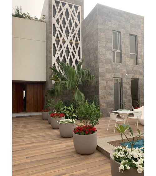 Un pot pour l'extérieur d'inspiration archaïque, comme les bols sculptés dans le bois. Des lignes pures pour un pot au design simple et discret, respirant déjà l'odeur du classique. Cup, ameublement design par Naoto Fukasawa pour Serralunga 1825. Couleur gris tourterelle