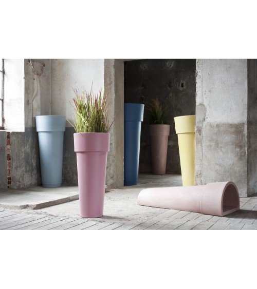 Mouvement vertical, dans un jeu de proportions et de déformations, le vase à double bord est réinterprété, il se lève, s'étire. Marcantonio Light est une ligne de pots, disponibles aussi dans la version lumineuse et conçue par Serralunga pour sa gamme de jardin et ameublement design. Couleur bleu Provence.