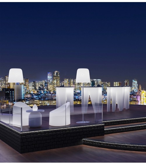 Étude des proportions pour la lounge-chair Bay compacte qui enveloppe commodément grâce à la grande assise. Légère, harmonieuse, essentielle, aux dimensions contenues, caractérisées par un signe sur les contours et sur l'arrière du dossier, qui calque la couture dune découpe de couturière, comme pour rappeler le rembourrage dun fauteuil en tissu. Couleur neutre. Système d'éclairage IP67 avec câble noir de 3 mt. et connecteur antisplash bipolaire shuko - alimentation 220-240V - avec empoule fluorescente à basse consommation d'énergie 20W (E27). Designer : Raffaella Mangiarotti
