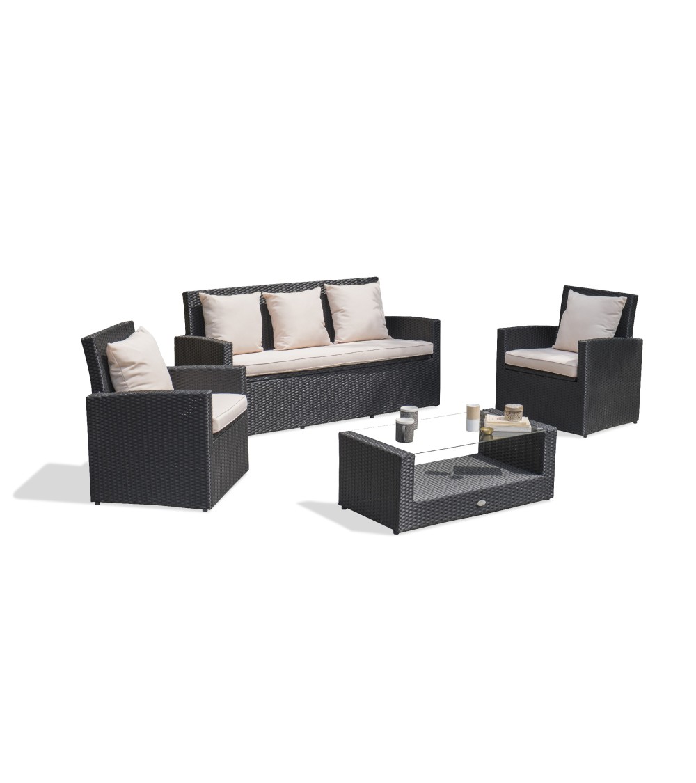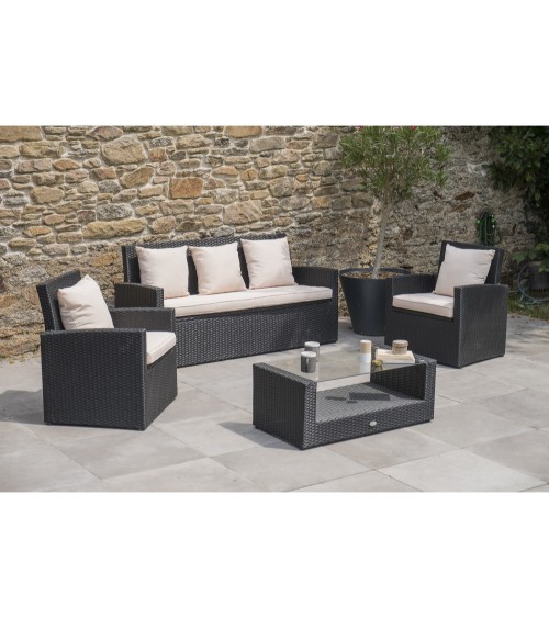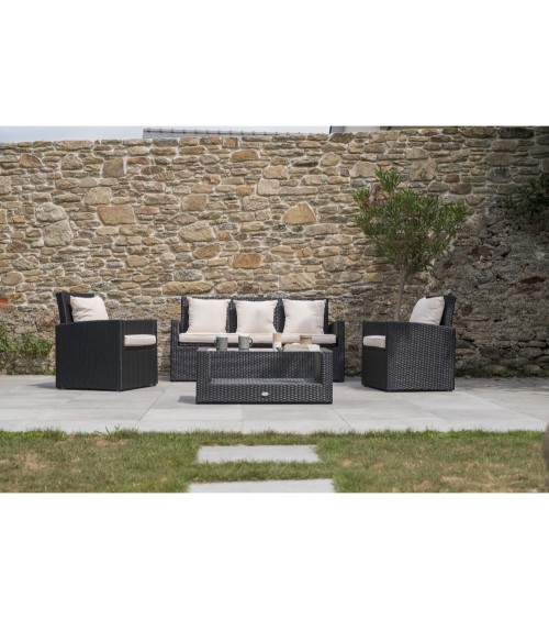 Salon de jardin 5 places en résine tressée noire et structure acier, composé d'une banquette 3 places, de 2 fauteuils et d'une table basse avec plateau verre. Coussins déhoussables en toile 100% polyester écru.DIMENSIONSBanquette : L 160 x l 64 x H 79 cmFauteuil : L 66 x l 64 x H 79 cmTable : L 93 x l 49,5 x H 37 cmHauteur d'assise : 44 cmVerre : L 80.5 x l 50 cm