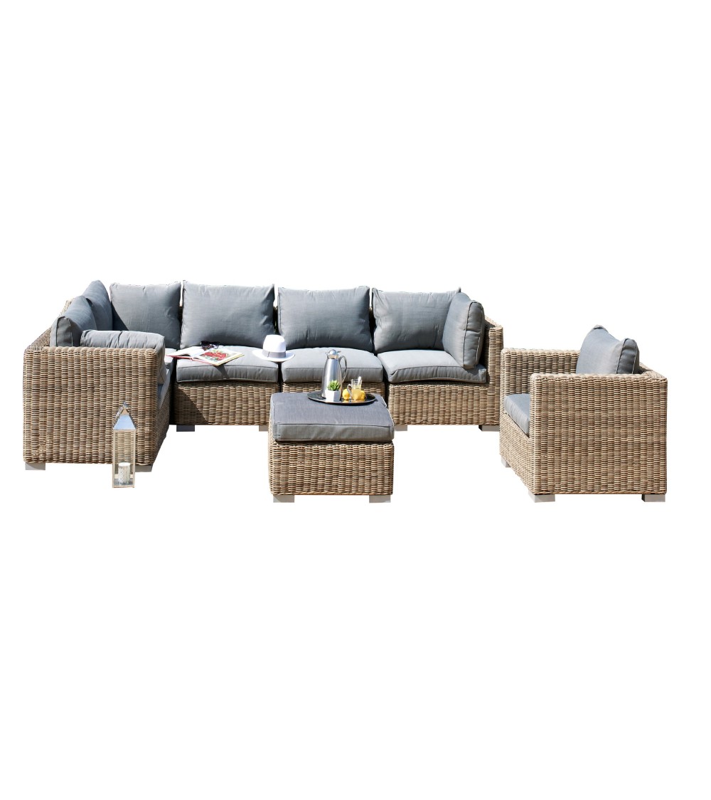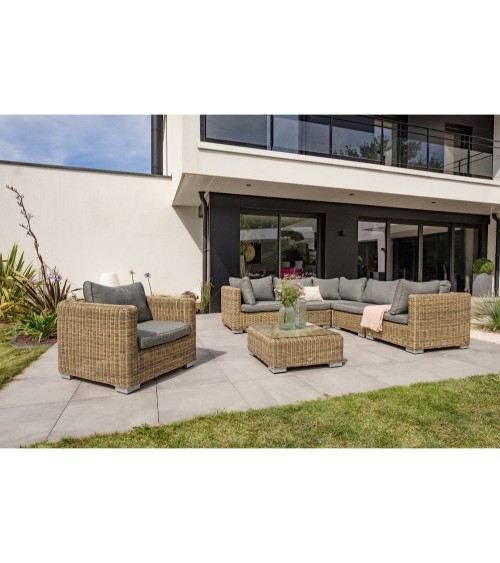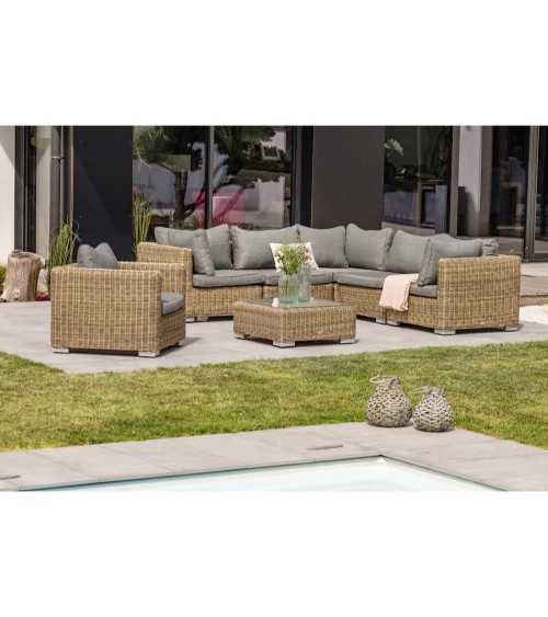 Produit à usages professionnels et particuliers. Salon de jardin 6 pl alu, résine tressée miel composé de 1 fauteuil, 3 modules d'angle, 2 modules centraux, 1 table basse avec plateau verre trempé. Coussins déhoussables 100% polyester gris.DIMENSIONSFauteuil : L 84 x l 84 x H 65 cmModule : Angle : L 84 x l 84 x H 65 cm/Central : L 76 x l 84 x H 65 cmTable basse : L 74,5 x l 74,5 x H 32 cmEpaisseur coussin : Assise : 10 cm/Dossier : 21 cmChoisissez le salon de jardin professionnel MONTMARTRE pour aménager votre salle de restaurant ou votre terrasse.